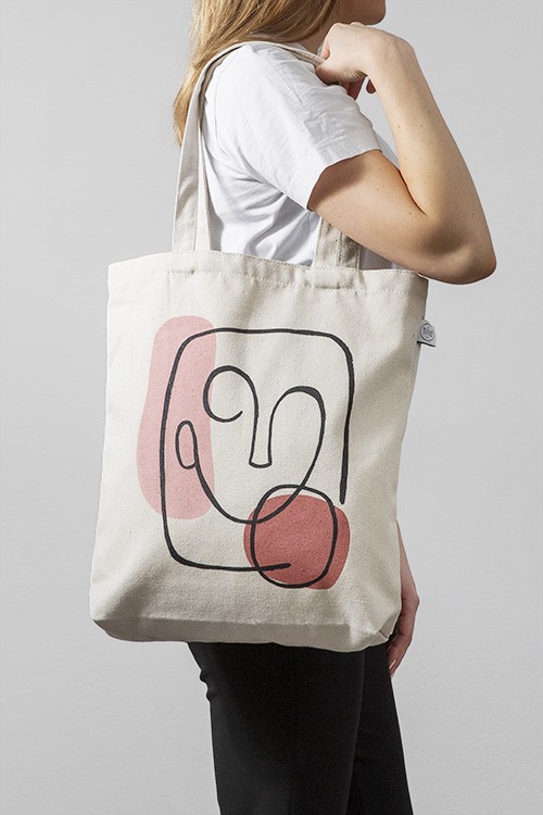 Handpicked design Tote bag in natural beige with an illustration of an abstract face and beige shapes. Add a tote bag to your wardrobe for a useful and stylish accessory! The tote bags in our limited edition collection are printed in Sweden and made of 100% recycled cotton.