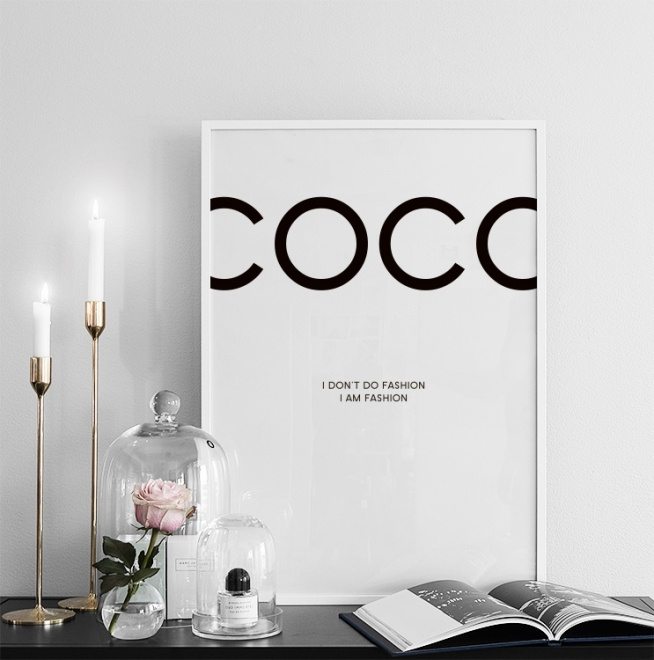 Handpicked design Fashion print in black and white with the text "COCO I do not do fashion I am fashion". If you're a true fashionista it should be reflected in the art you keep at home! Fill you walls with fashion prints in various colours and sizes for a complete look. This simple print also makes a great pair with some floral posters!