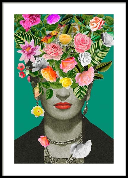 Handpicked design Photograph in black and white of the artist Frida Kahlo with a checkered shirt and flowers in her hair. Fill your home with classic photographs of your favourite icons, and you'll be all set.