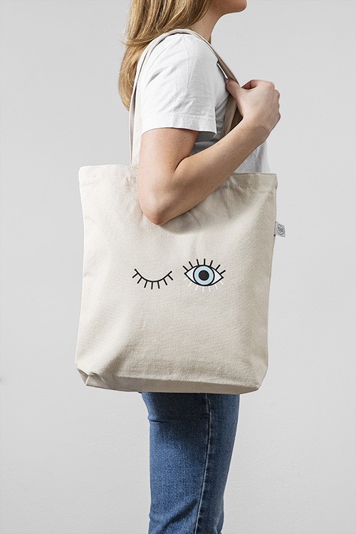 Handpicked design Tote bag in natural beige with one closed and one open eye. The trendy designs make our tote bags unique and something you'll be proud to wear! The tote bags in our limited edition collection are printed in Sweden and made of 100% recycled cotton.