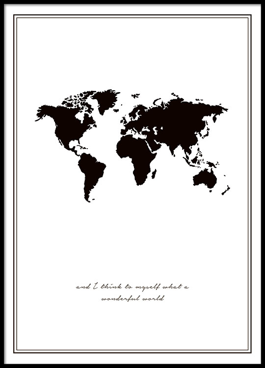 From $8.72Black-and-white world map poster and lyrics from the song 'What a Wonderful World'. Absolutely gorgeous and matches perfectly with one of our elegant frames. Can also be hung with clips to achieve a modern, austere style. We have plenty of world maps in various designs in our Maps and Cities category. The poster has a 'built-in' mount which elegantly frames the image.