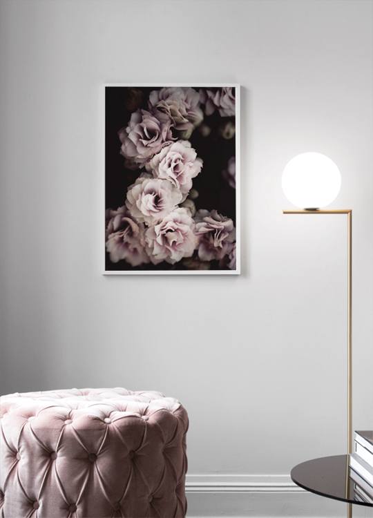From $34.97Dark botanical poster that fits perfectly in a romantic bedroom. The light purple flowers against the dark background create a luxurious feel and the poster goes perfectly with velvet furniture. Combine with a stylish typographic print to create an interesting contrast, or pair it with one of our other floral designs.