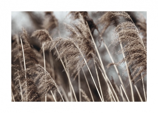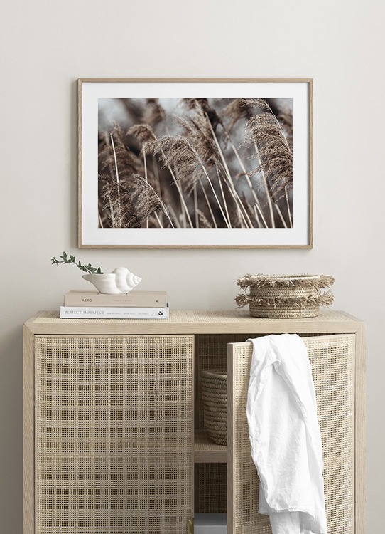 Handpicked design Photograph of beige, dried grass with a blurry background. The dried grass trend is not going anywhere, and if you have some dried grass in a vase on your coffee table you'll be able to combine it with matching prints.