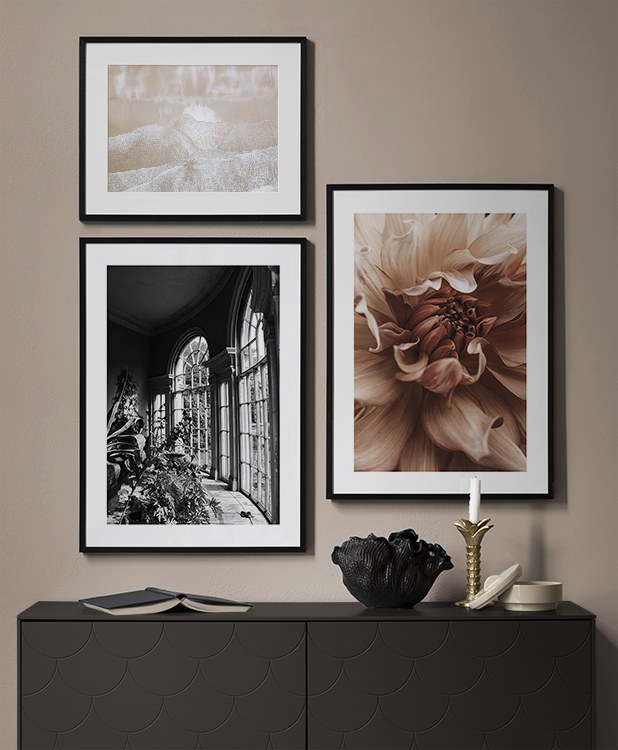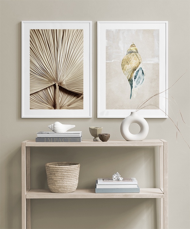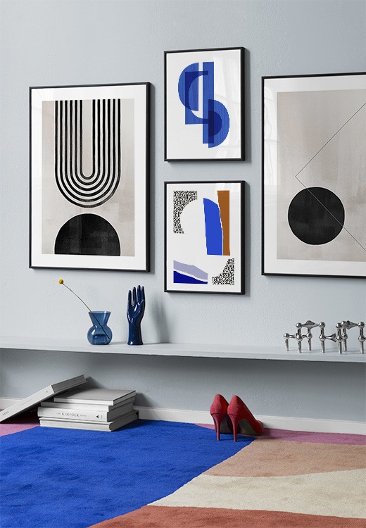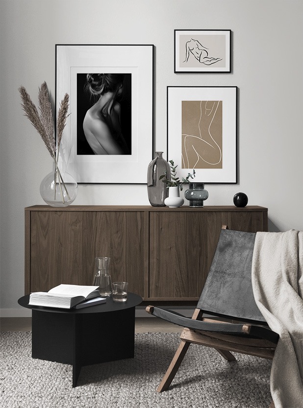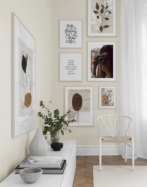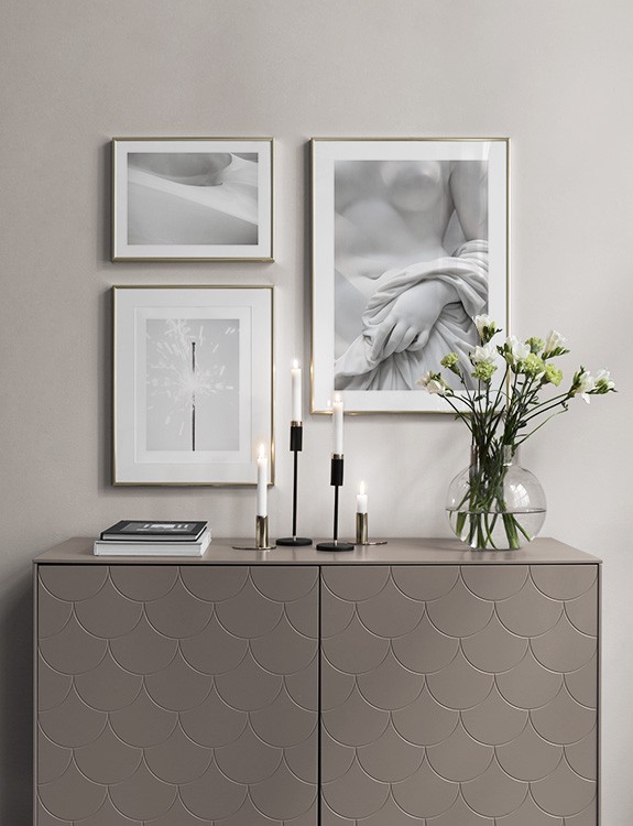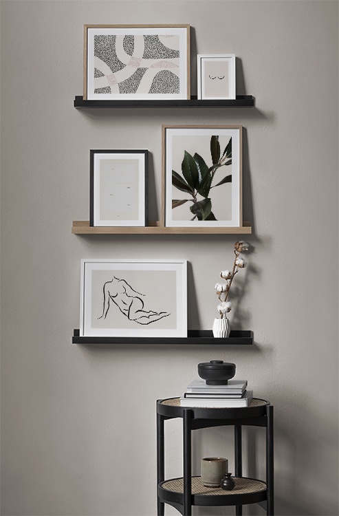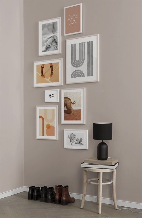 One of our best tips is to use storage as a canvas for your art – you don’t always need to drill holes into walls! Let prints rest on a hall shelf or bench against the wall, or assemble an elegant still life around the art. This will make it easy to vary your hallway decor according to the season or even your mood! If you prefer to hang up your art, you can compose a modern gallery wall that suits both small and large hallways.