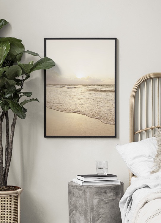Handpicked design Photograph of the ocean and a beach with beige sand during the golden hour. By adding prints to your walls in warm hues with calm views, you'll feel that inner peace. Nature prints also are a great style if you want a relaxed feel at home, and you can find more prints in our category Nature.