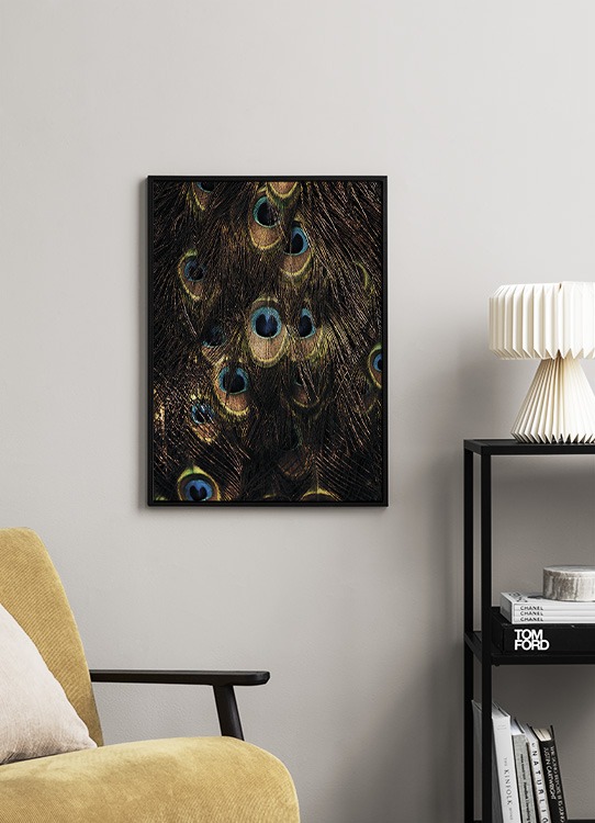 Handpicked design Close up photograph of peacock feathers in brown with blue details. If you want to get that high-end and luxurious style at home, a print like this one is simply a must. The rich and dark colours are perfect for both a home where your interior goes in lighter hues as well as darker ones.