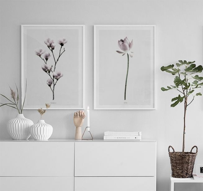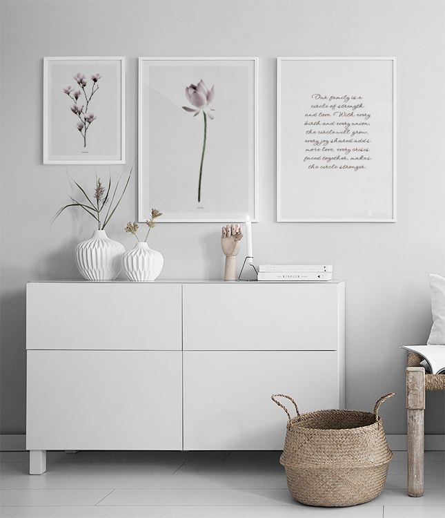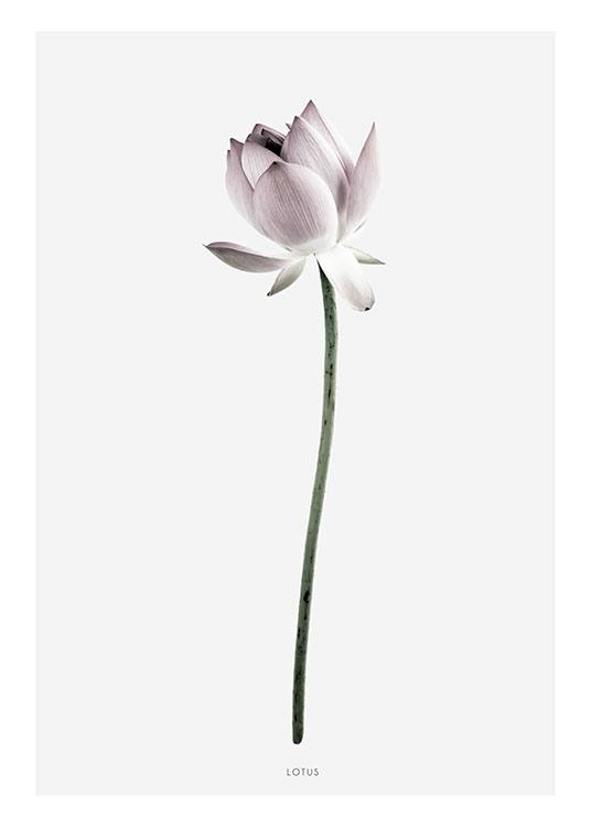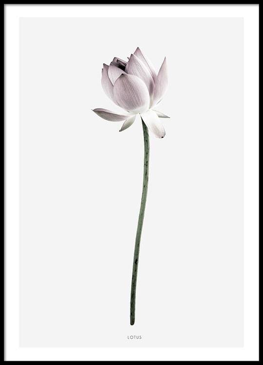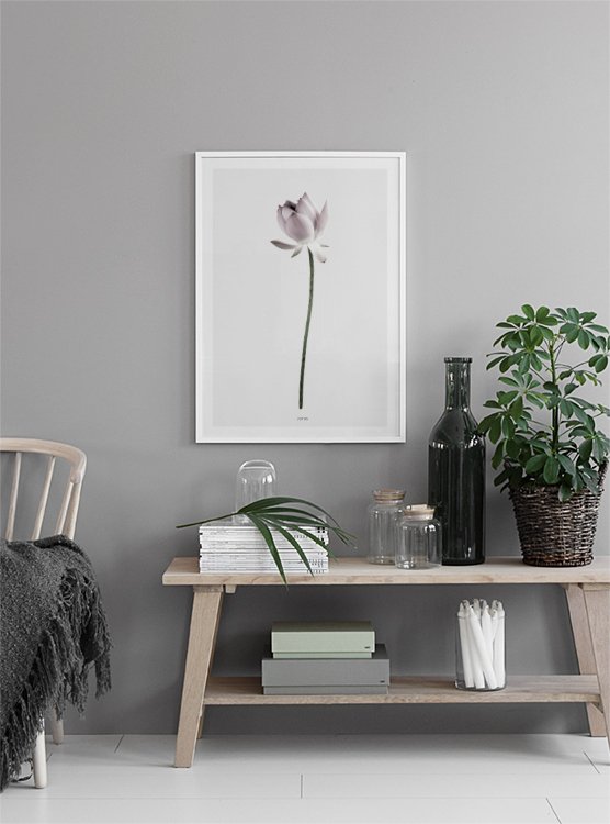 Handpicked design Beautiful botanical poster with a photograph of a lotus flower. The poster has grey background and a white border. Looks amazing when combined with Magnolia - our other botanical print in the same series, or with one of our text posters. Click here for inspiration on how to put together your own art wall collage. The poster is printed on 200 gr high-quality, uncoated paper that will last. The poster has a built-in mount which elegantly frames the image.