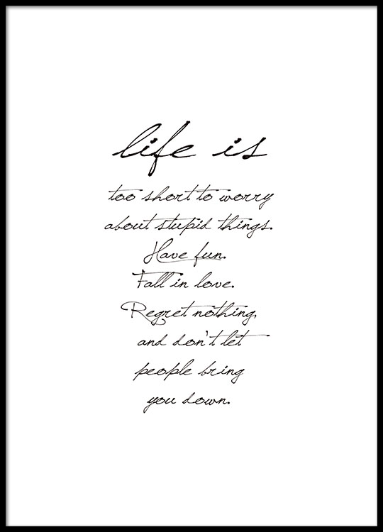 From $49.95Text poster with the text 'Life is too short to worry about stupid things. Have fun. Fall in love. Regret nothing, and do not let people bring you down.'. Explore our category with Text & Quotes to find more prints with quotes and texts that you can have in your home as daily reminders of the small things in life.