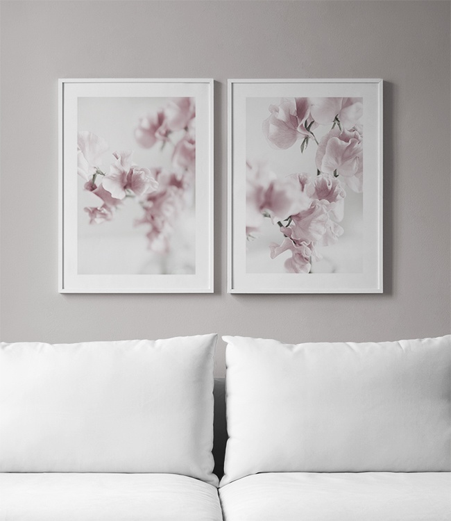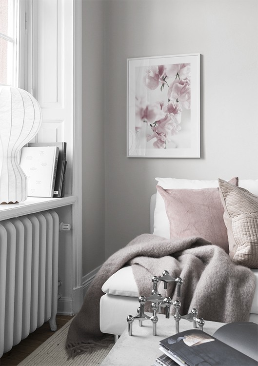 Handpicked design Elegant photo poster of pink flowers. This botanical photo print is the perfect decoration in, for example, a living room. The floral design in pink suits any home and can also be combined with other posters and prints. The poster has a white border which elegantly frames the design.
