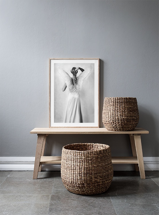 Handpicked design "We are a proud retailer of Tove Frank's amazing posters! The Lai poster from Tove Frank's Essence series is an alluring photo poster depicting a woman from behind with white angel wings. The dreamlike black-and-white design mirrors the light and atmosphere frequently expressed by Tove Frank's photo art. The poster has a ""built-in"" mount which elegantly frames the photograph."