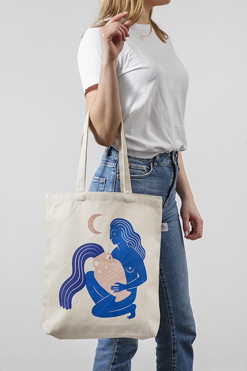 – Beige tote bag with a woman holding a vase, painted in blue with a half moon above her printed on the front