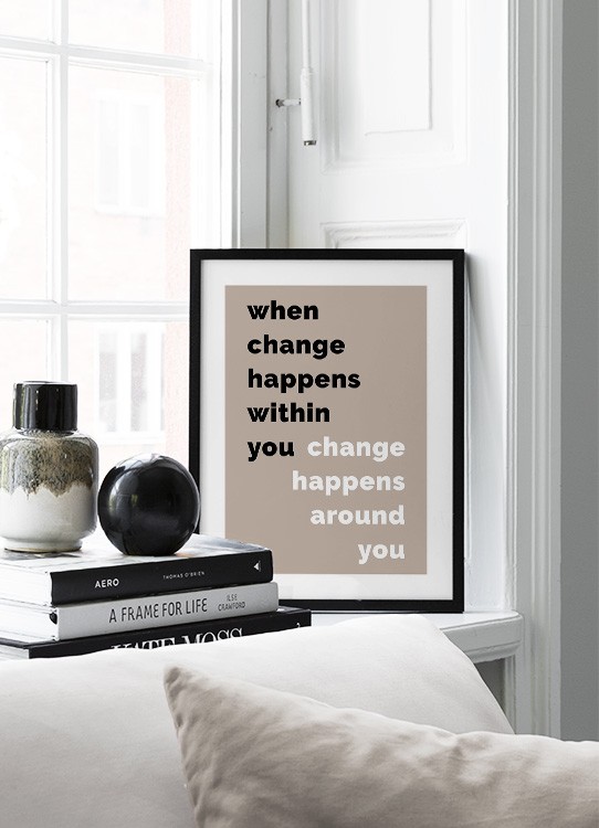 Handpicked design Text poster with the quote "When change happens within you change happens around you" in black and white on a beige background. Quote prints are the perfect way of making your home feel personal!