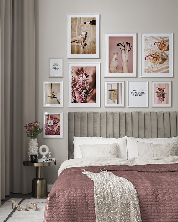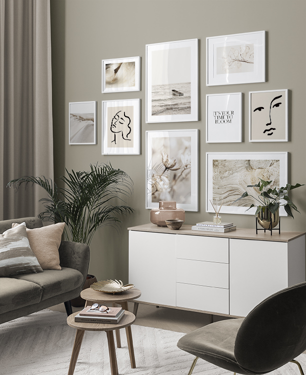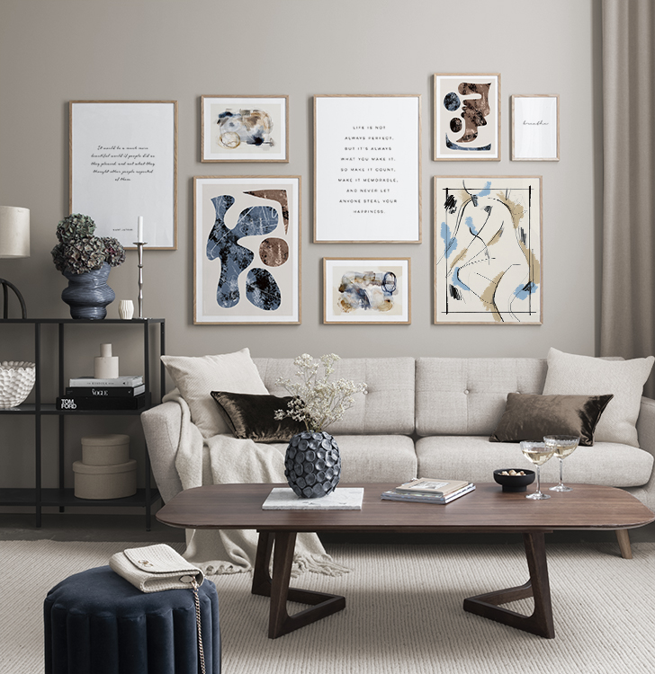 We add new gallery walls all the time according to the season and the latest interior design trends. Buying new designs and putting together new ensembles allows you to easily and affordably change your decor to reflect what you’re into at the moment.We create customised gallery walls based on rooms and interior styles. For example, you can buy a picture collage for a kitchen with gorgeous photographic designs for a more modern interior style, or you can get a stylish gallery wall for a living room with minimalist illustrations that fit perfectly into a Scandinavian interior design style.