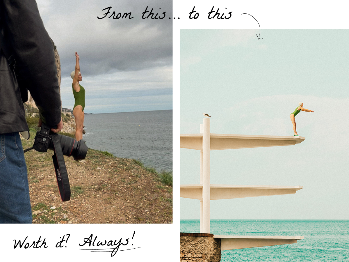 Several of the final photographs are the result of thoughtful creative composition. In Summer Height the diving board was photographed on its own, while the picture of the model standing was taken separately, on the edge of a cliff, by the roadside. The two images were later combined to create the final striking photo.