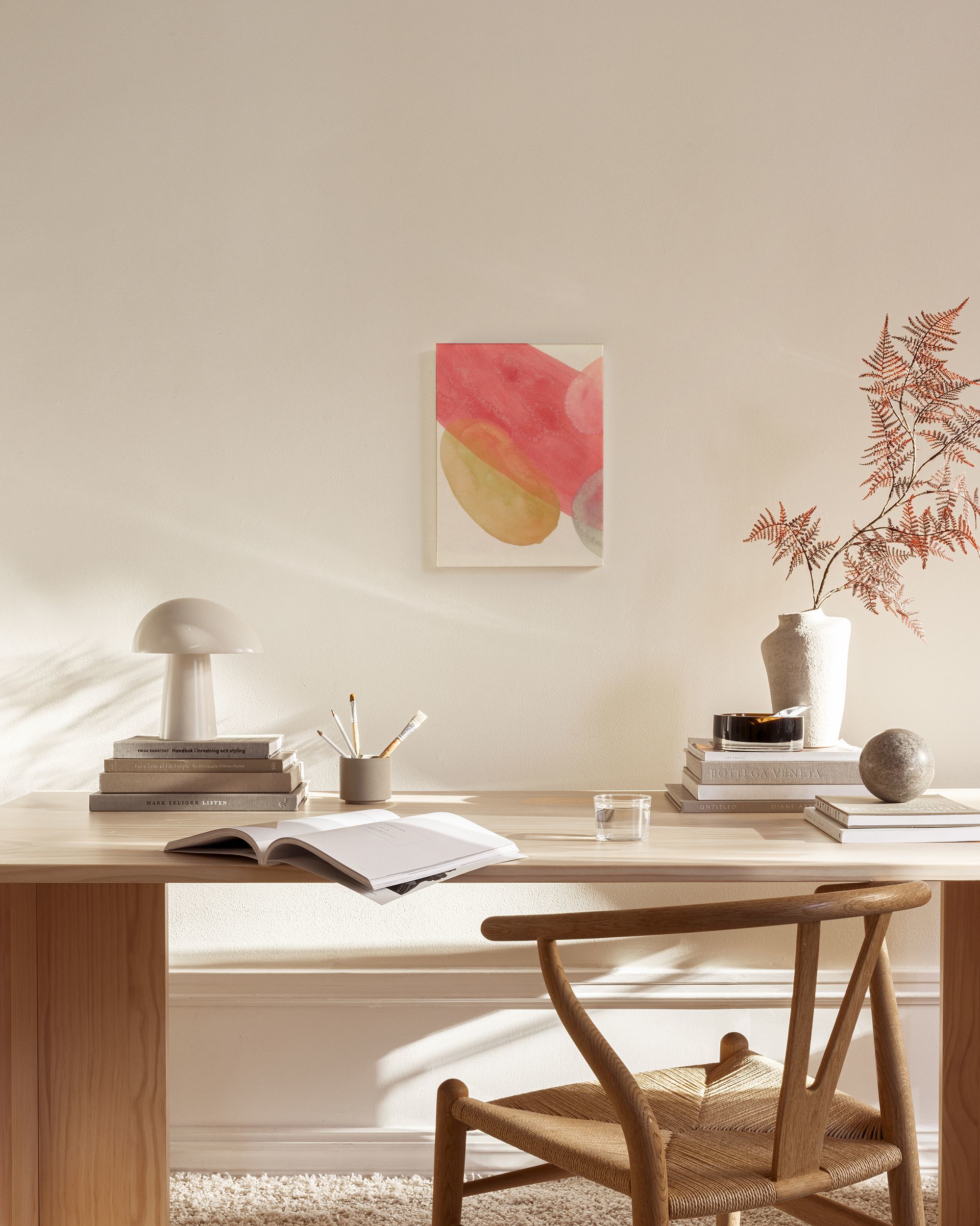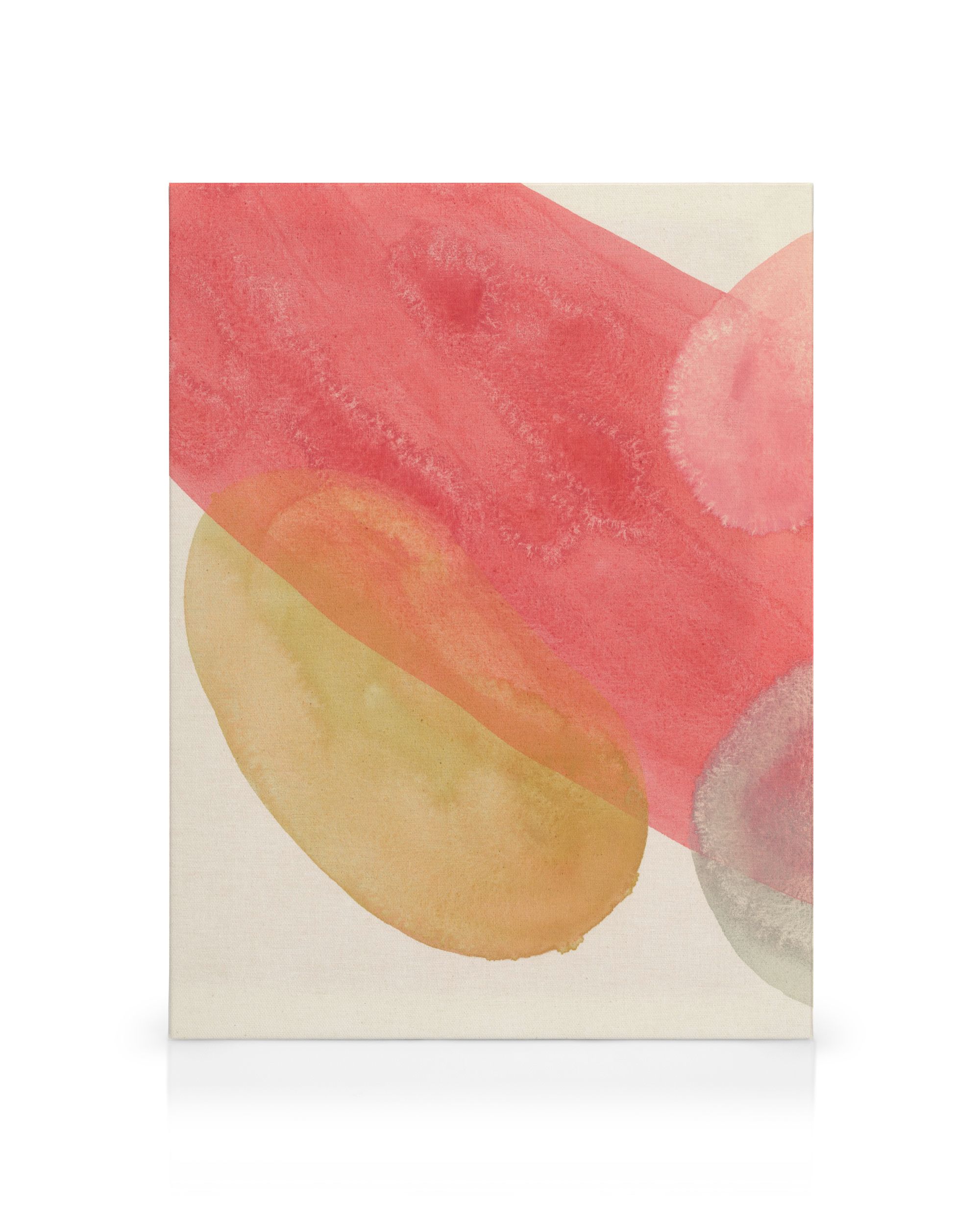 A canvas print featuring abstract shapes in red, pink, yellow, and grey on a light background.