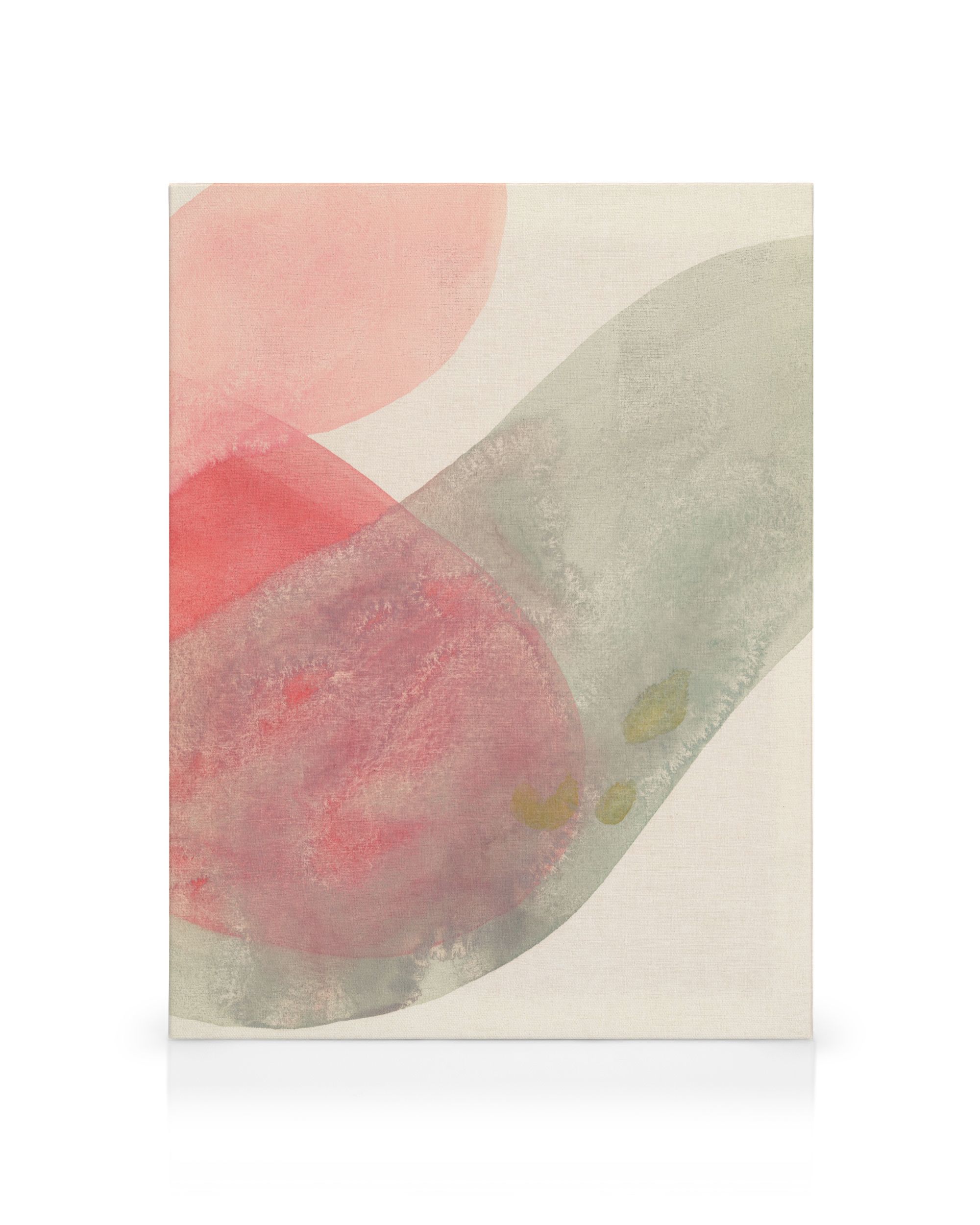 A canvas print with soft, overlapping shapes in pink and green with a watercolour texture.
