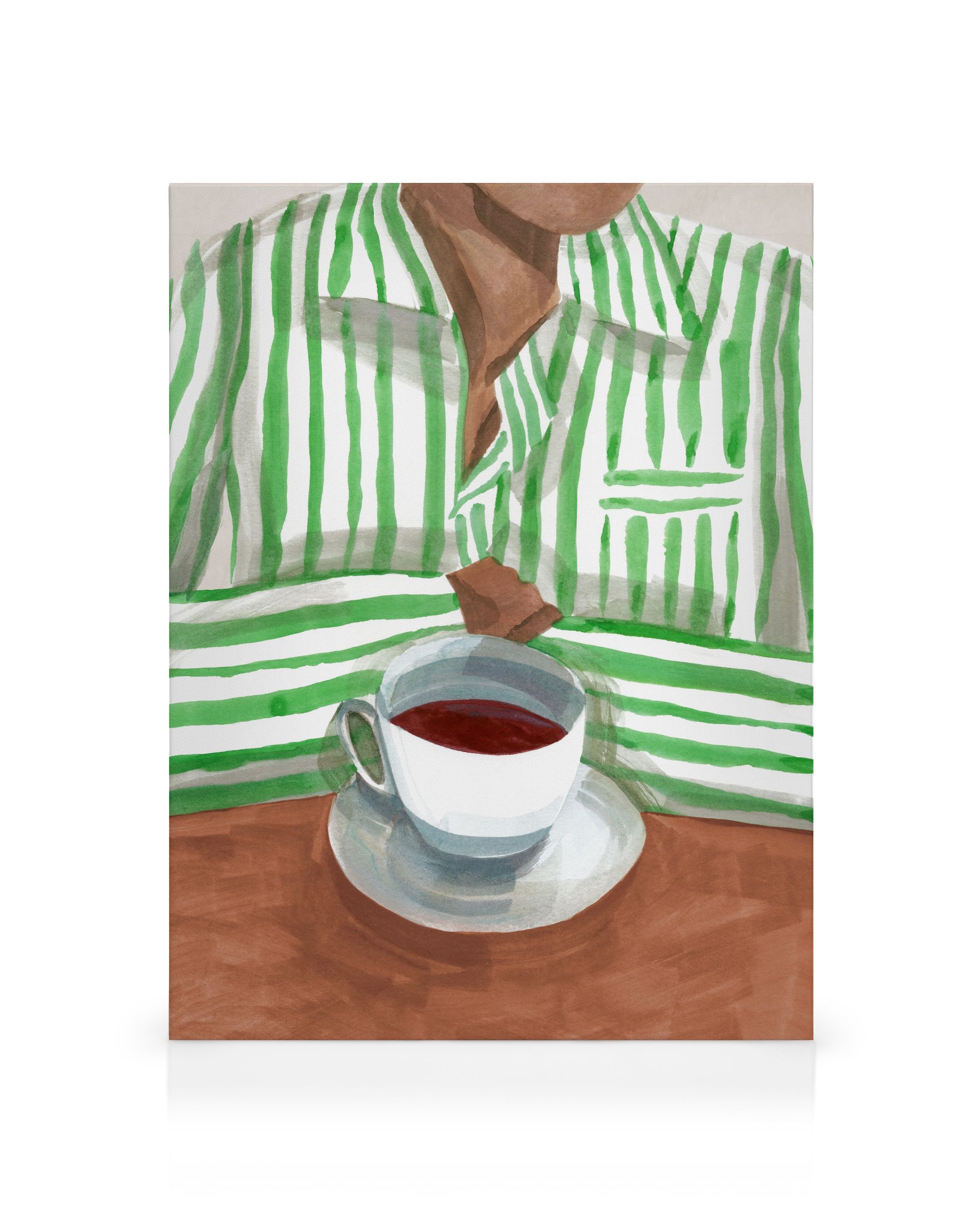 From $24.98A canvas print showing a person in a green and white striped shirt holding a white cup with dark liquid. Soft, painterly style with a cosy feel.