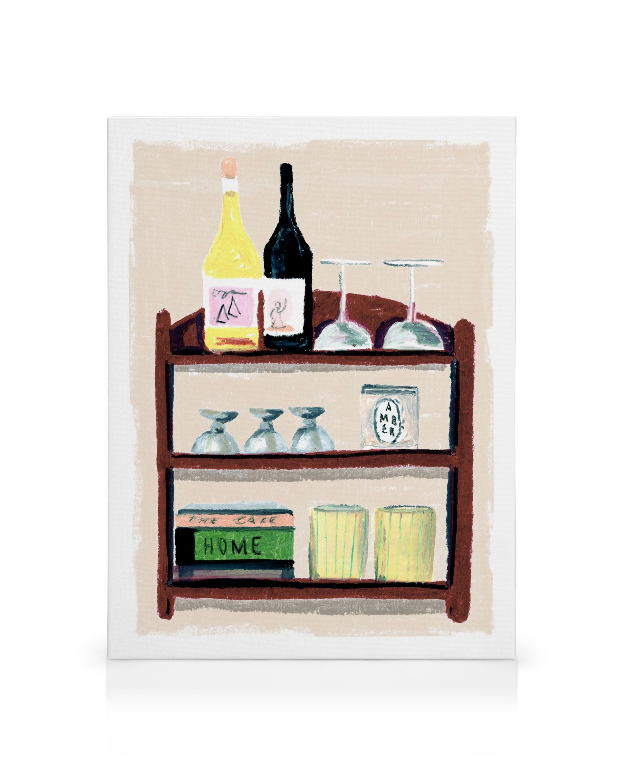 From $24.98A hand-painted canvas print of a wooden shelf with bottles, glasses, jars and books in yellow, green and pink against a beige background.