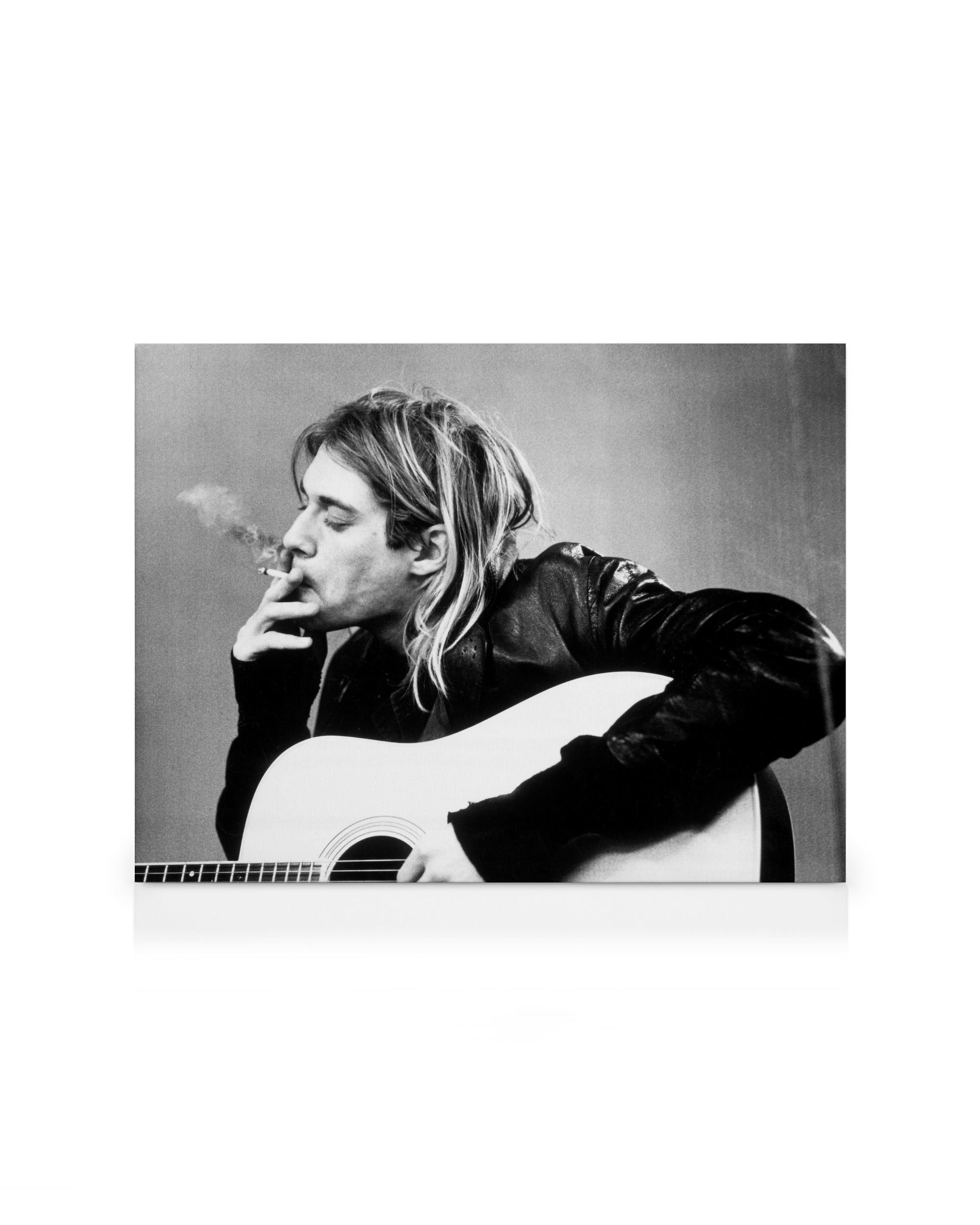 A black and white canvas print of Kurt Cobain holding an acoustic guitar and smoking. Perfect wall art for music lovers.
