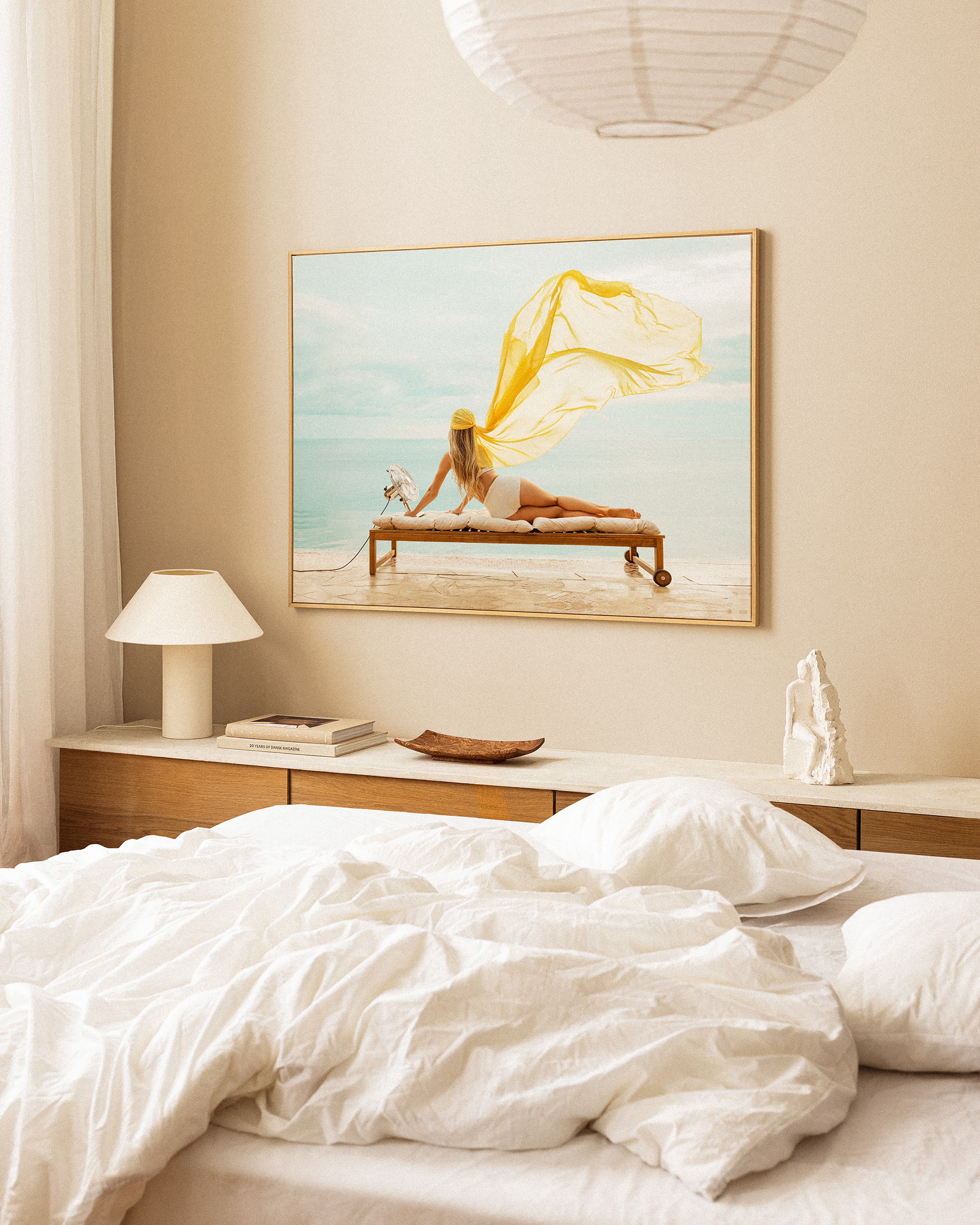 From $24.98A canvas print of a person relaxing on a lounge chair by the sea, with a yellow headscarf and flowing fabric. The calm blue ocean and sky create a peaceful atmosphere.
