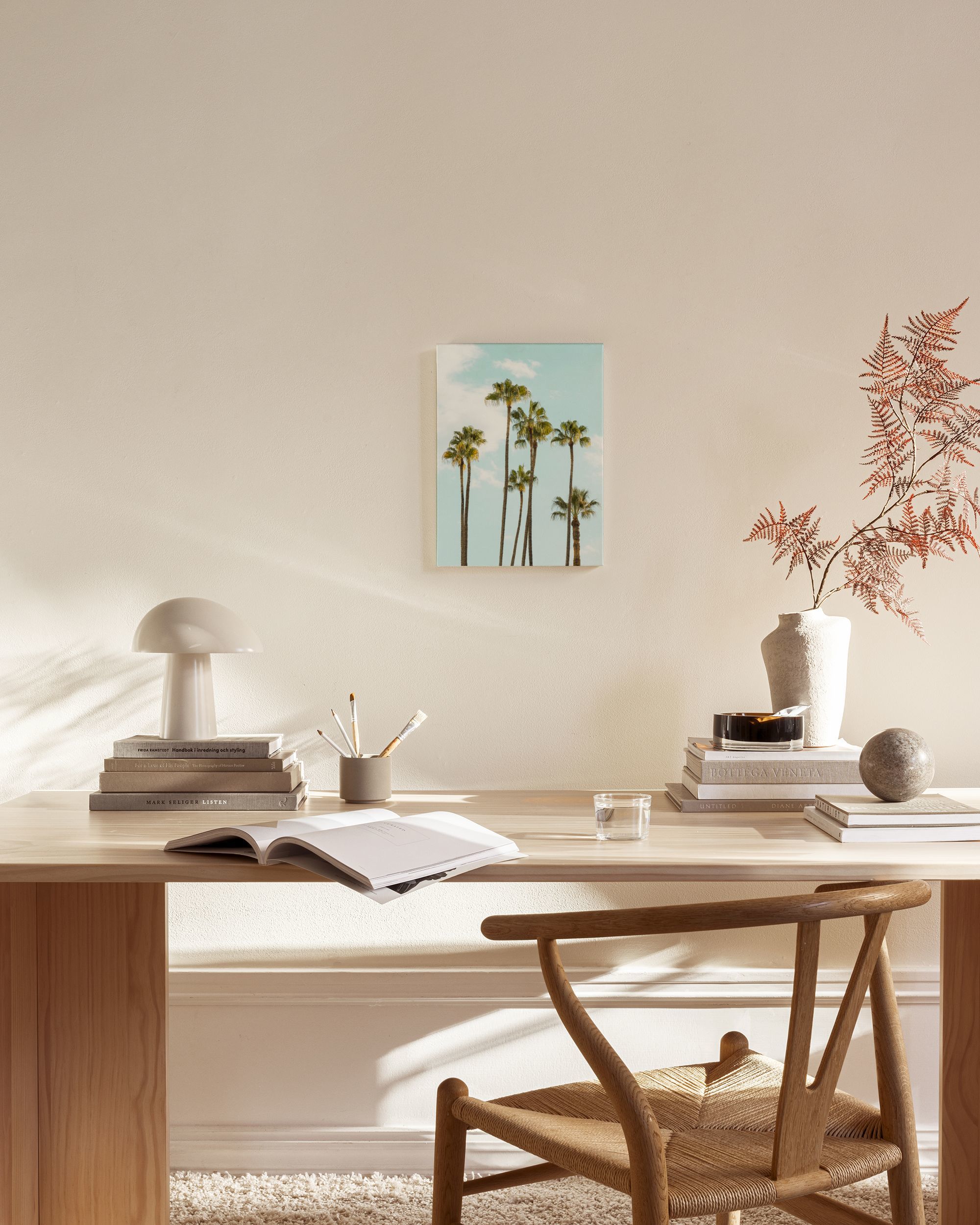A canvas print of tall palm trees against a bright blue sky. Perfect for creating a sunny, tropical feel in your home.