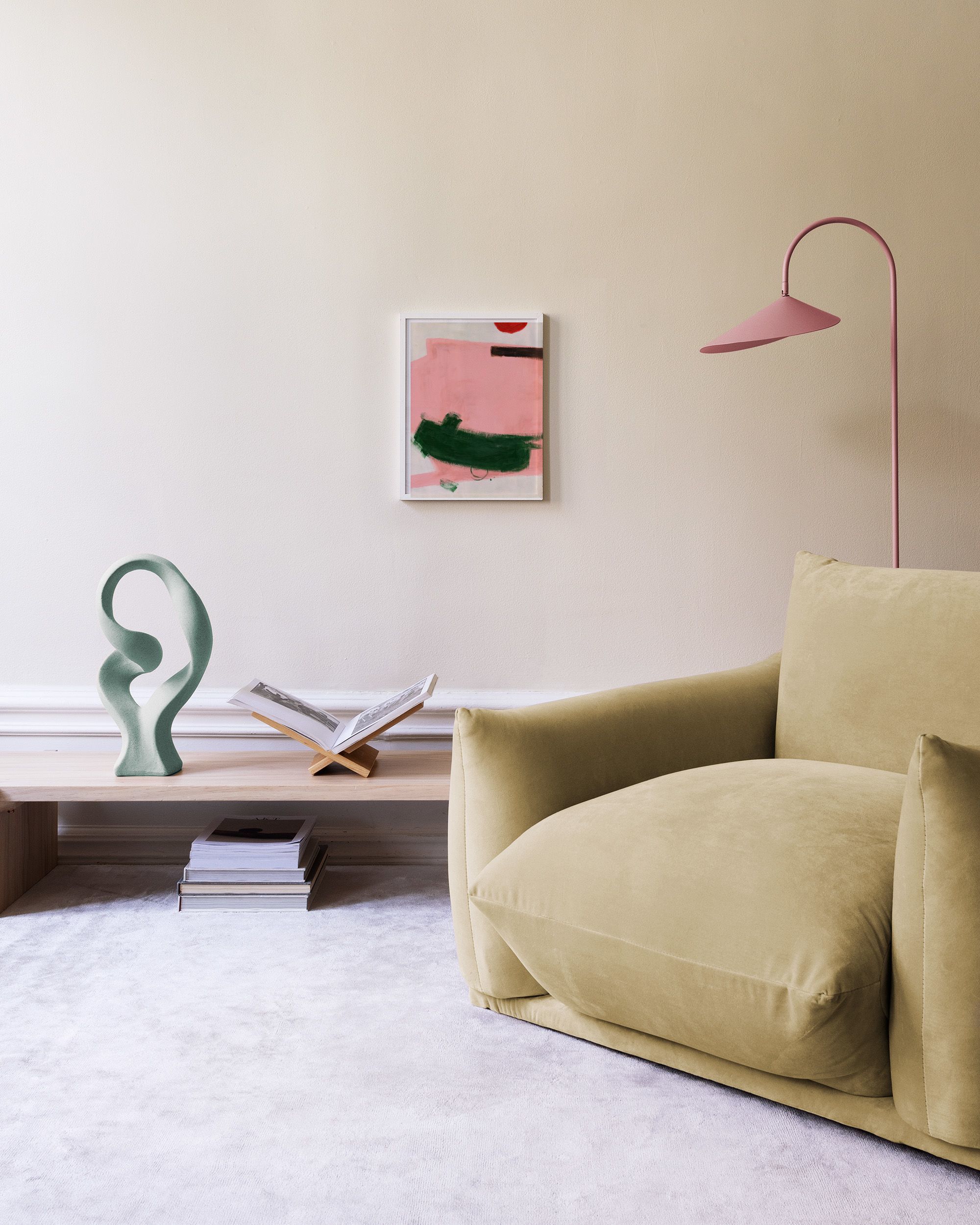Abstract print with green brushstrokes on a pink background. Perfect wall art to add colour to your home.