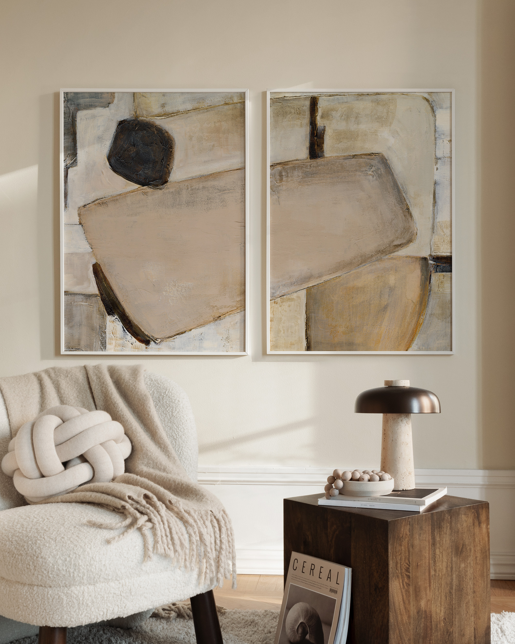 A modern print with overlapping shapes in beige and brown tones. The soft brush strokes create a calm, layered design.