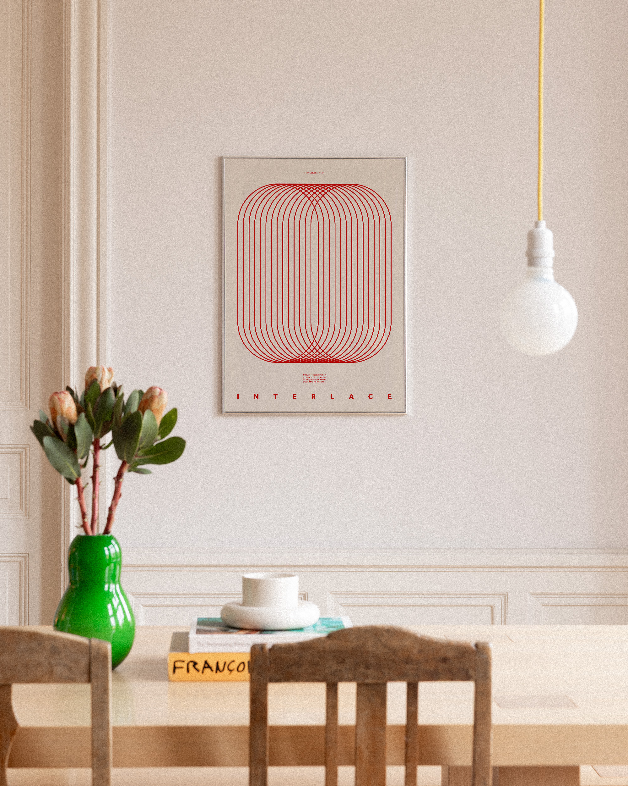 From $43.45A geometric print with red curved lines forming an interlaced pattern on a light beige background. Perfect wall art for a modern home.