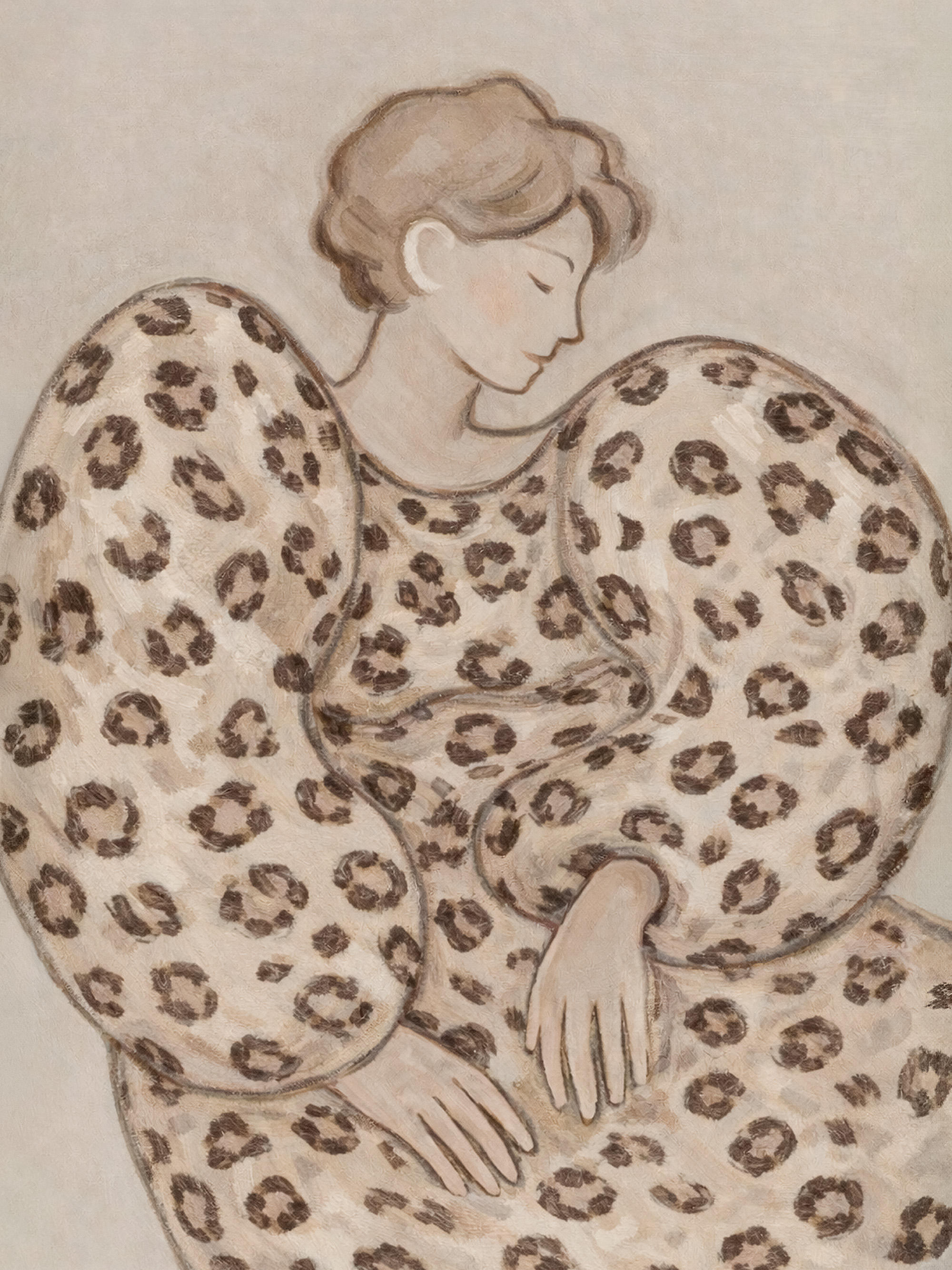 From $24.98A poster illustrating a person wearing a dress with a leopard print pattern in shades of brown and beige. The dress has large, puffy sleeves and the style is soft and painterly.