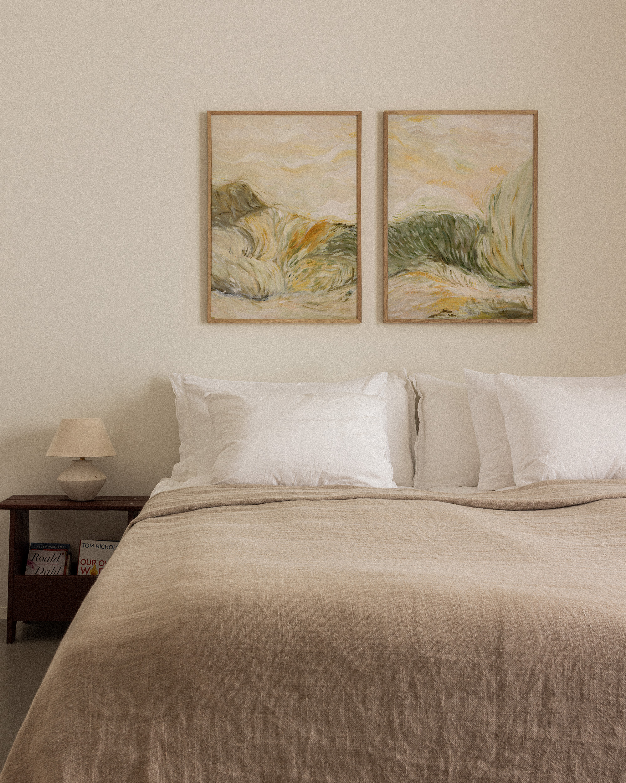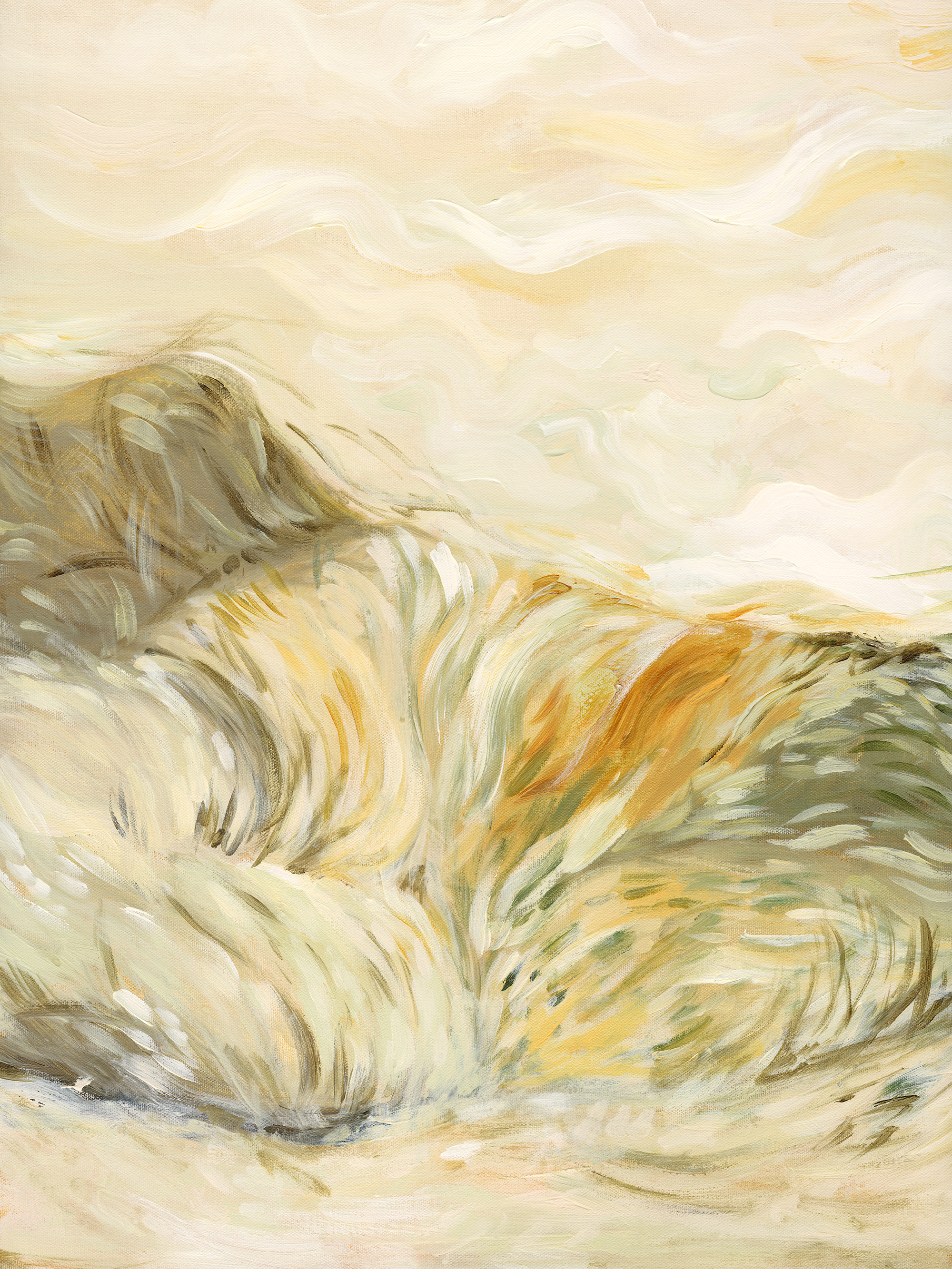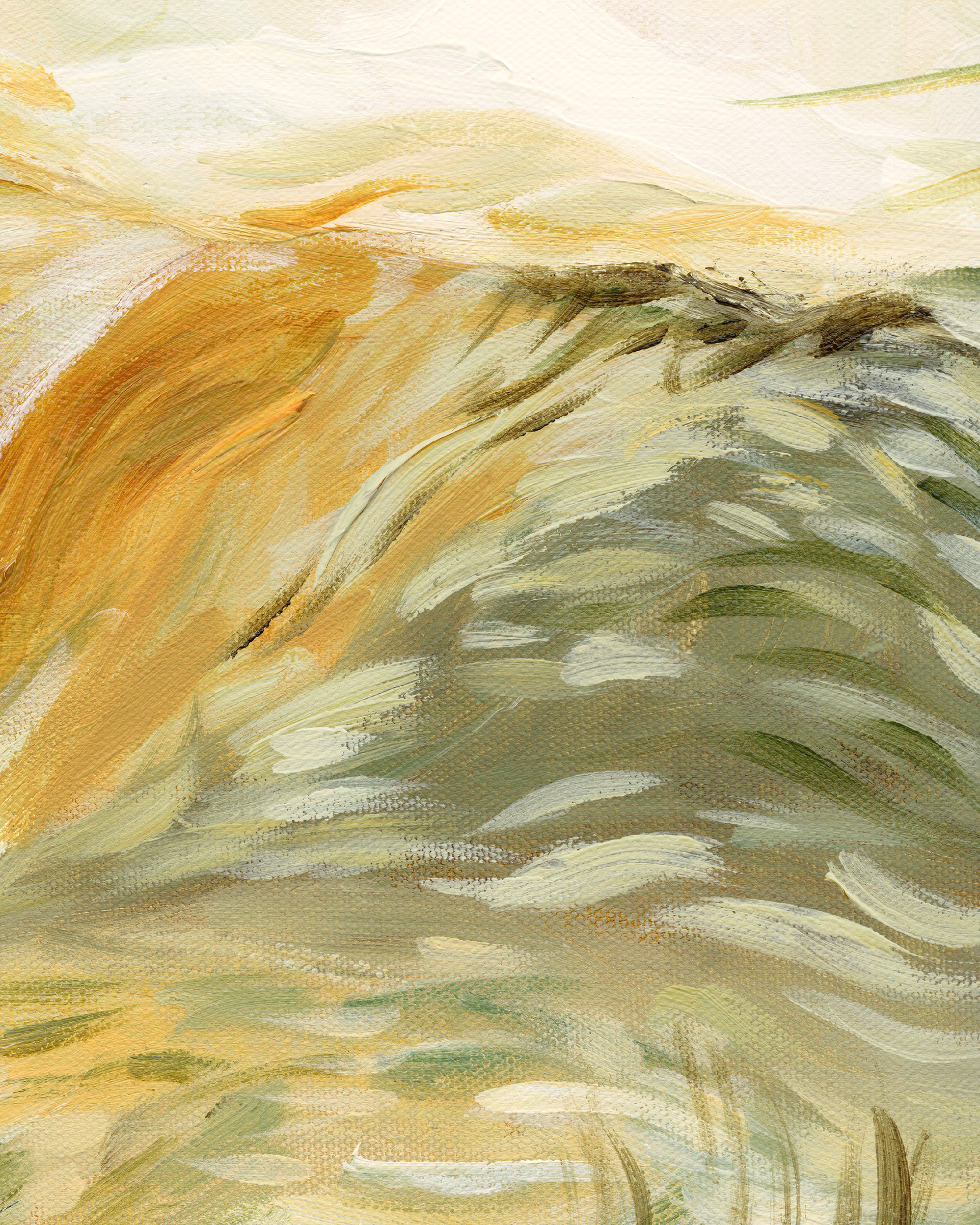 An abstract print with soft, swirling brushstrokes in earthy tones of beige, green, and brown.
