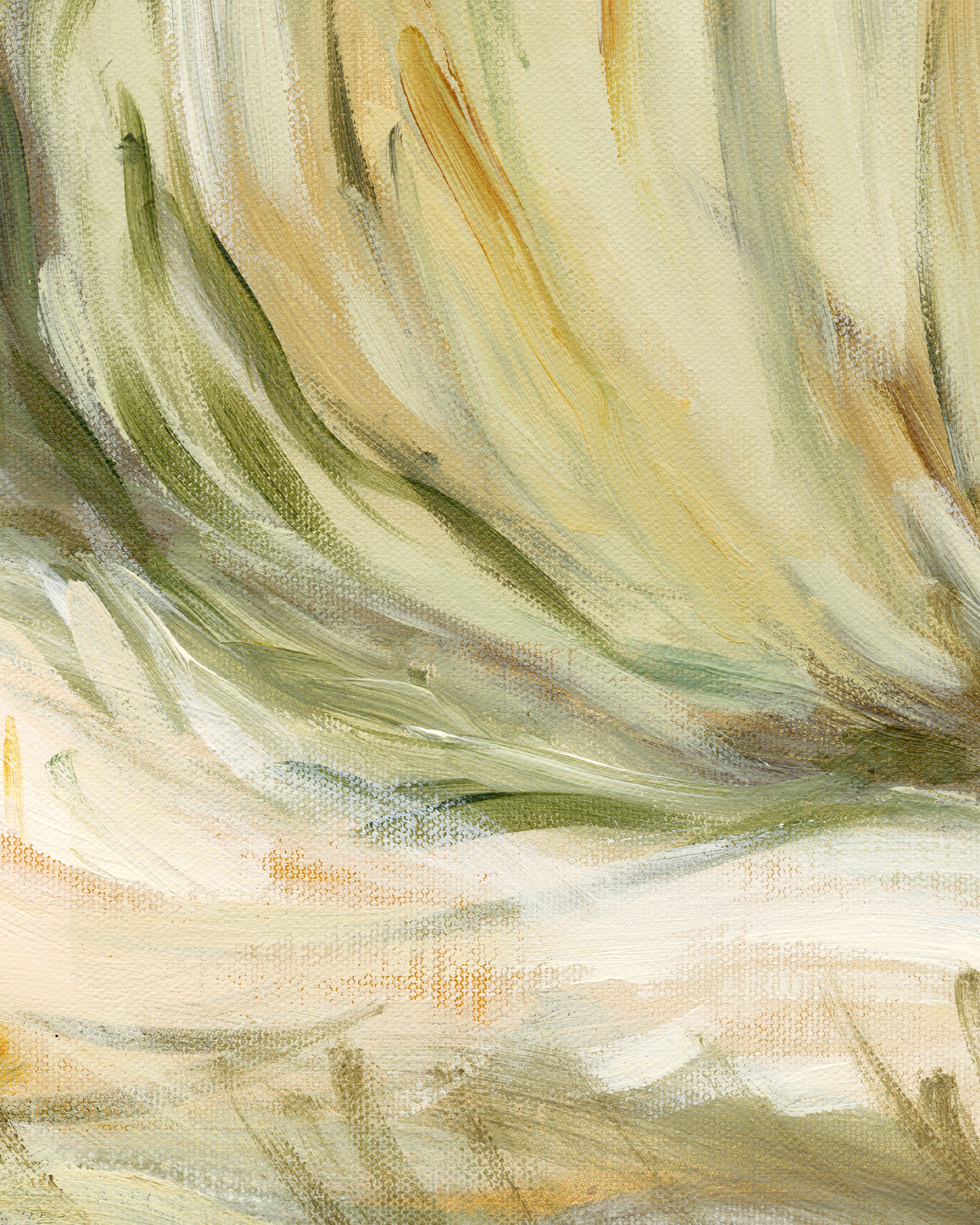 An abstract print with soft, wavy brushstrokes in green, beige and orange.