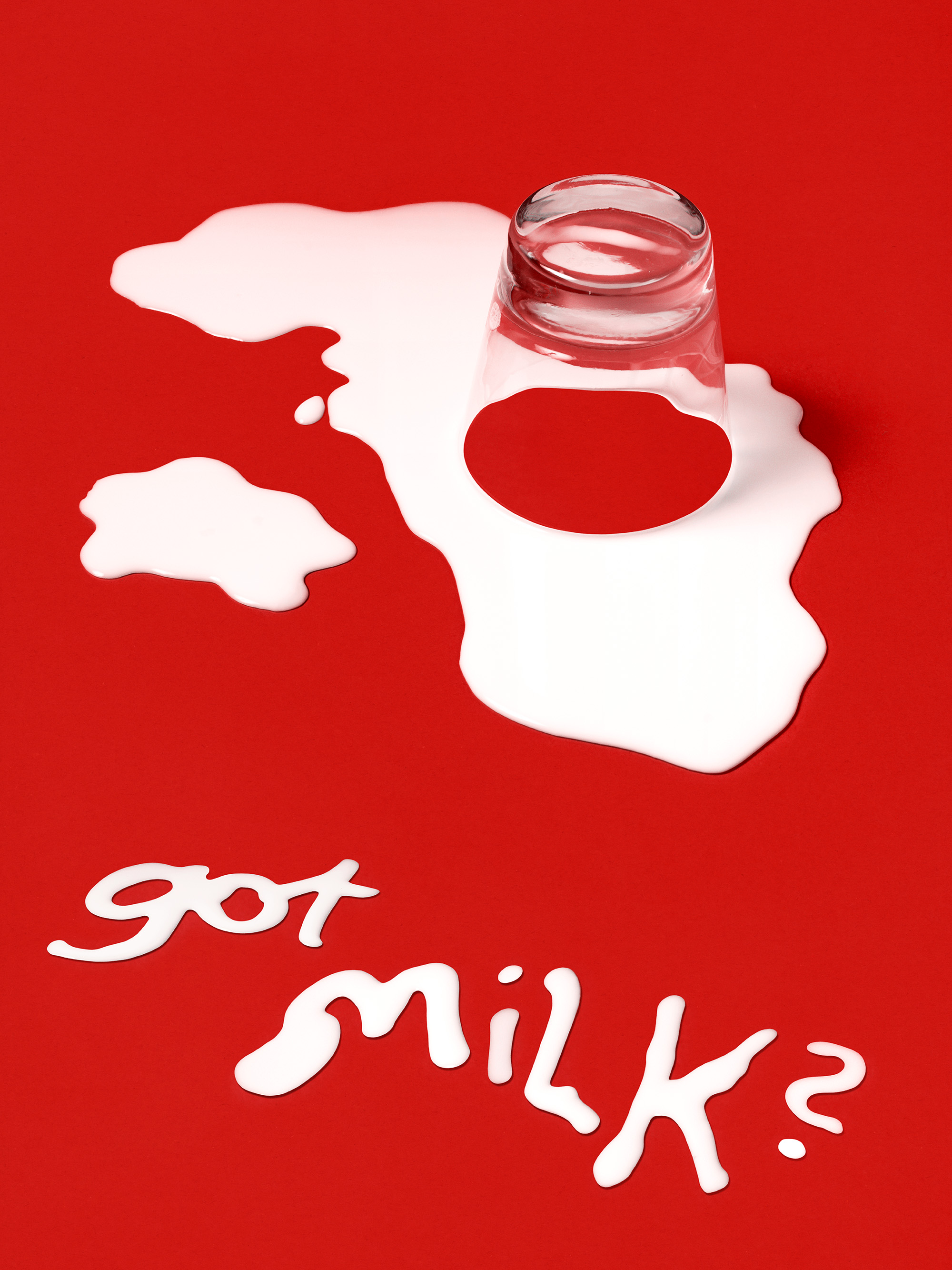 A print featuring a glass of spilled milk on a red background with the text "got milk?" in white.