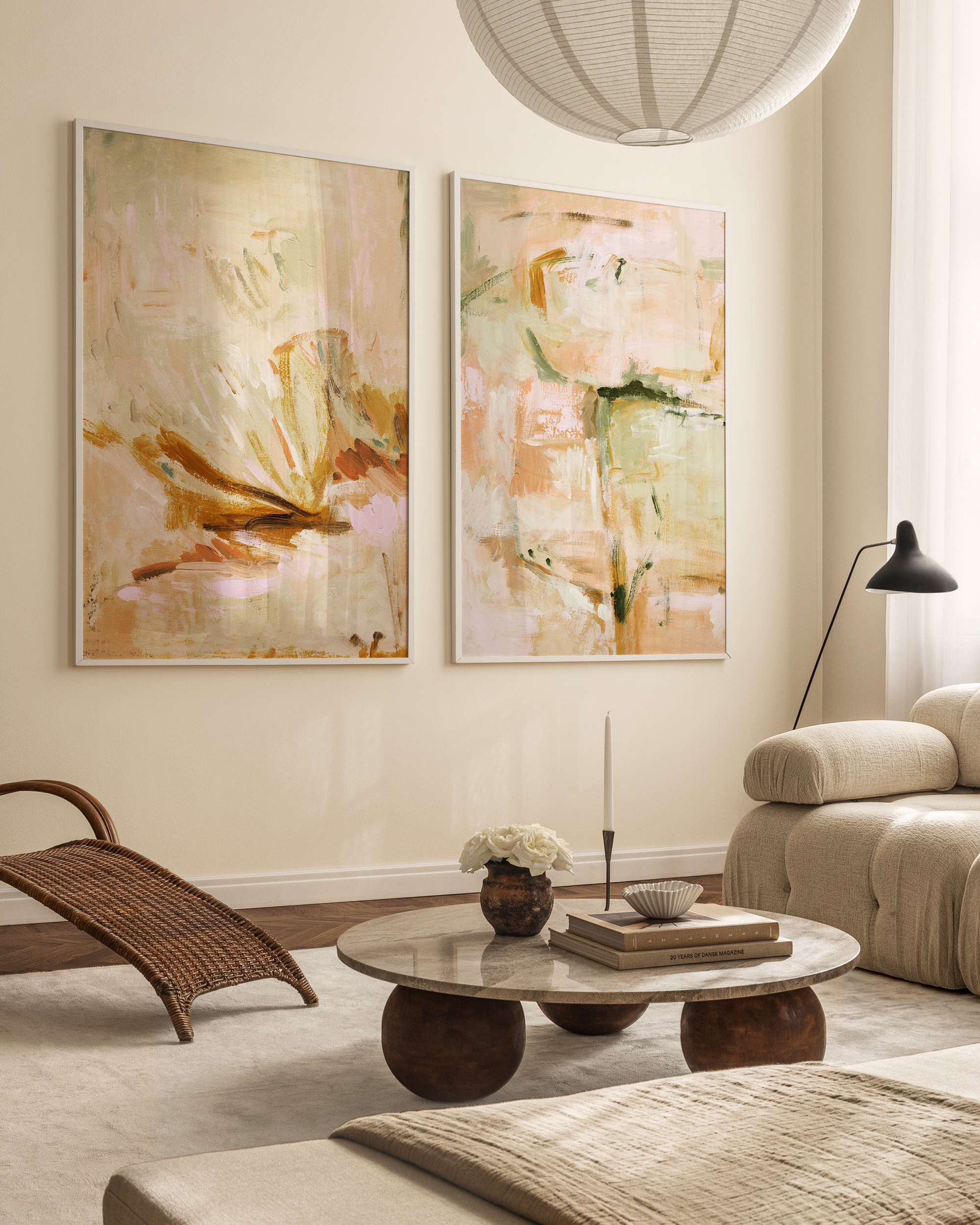 Abstract print with soft brushstrokes in light pink, peach, and beige colours. This hand-painted print has a calm and organic look.