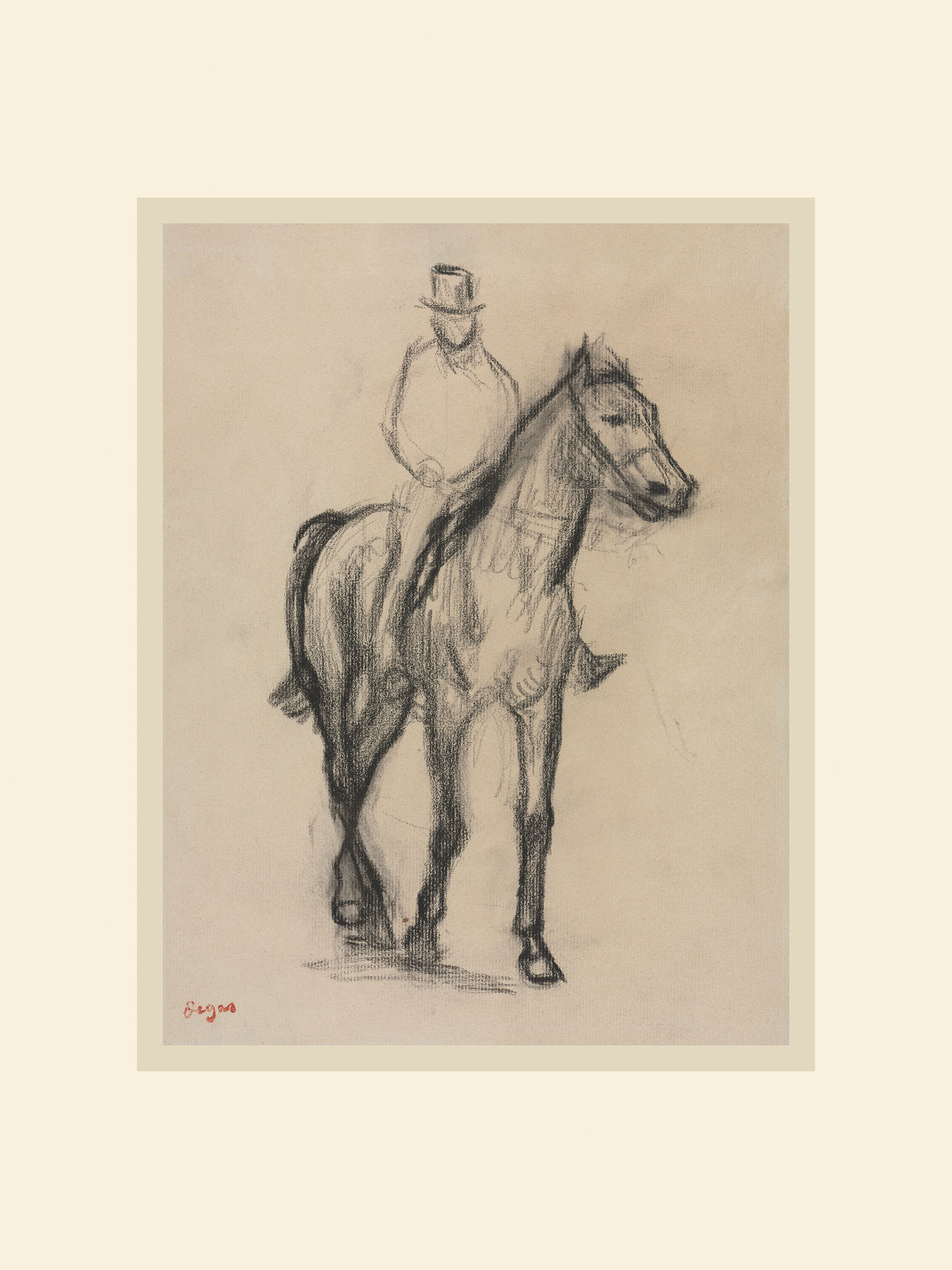 A pencil sketch of a person riding a horse on beige paper. The drawing features simple lines and soft shading, capturing the horse's movement in a minimalist style.