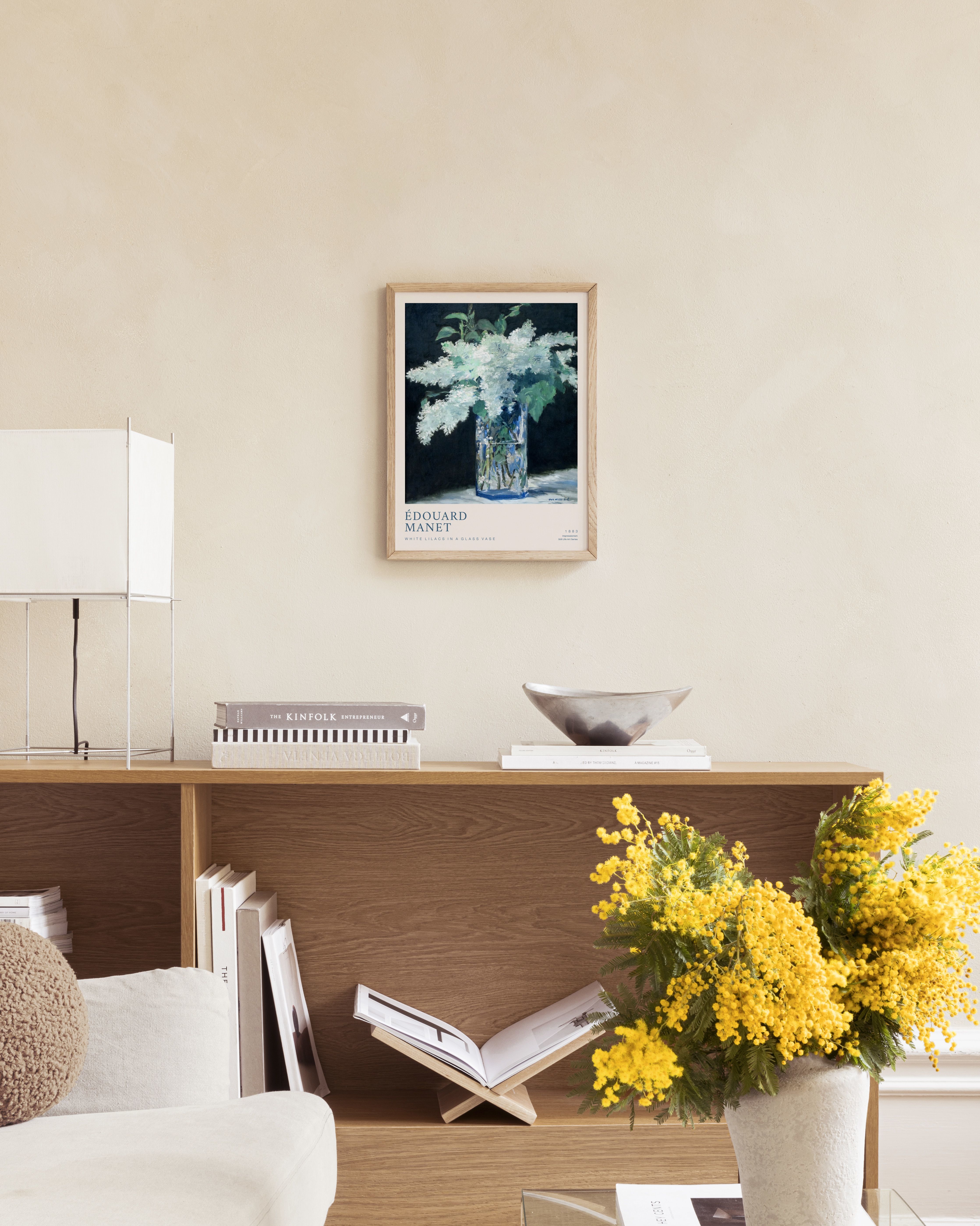 From $24.98A poster of white lilacs in a clear glass vase with green leaves. The flowers stand out against a dark background, while the vase reflects light with hints of blue and green.