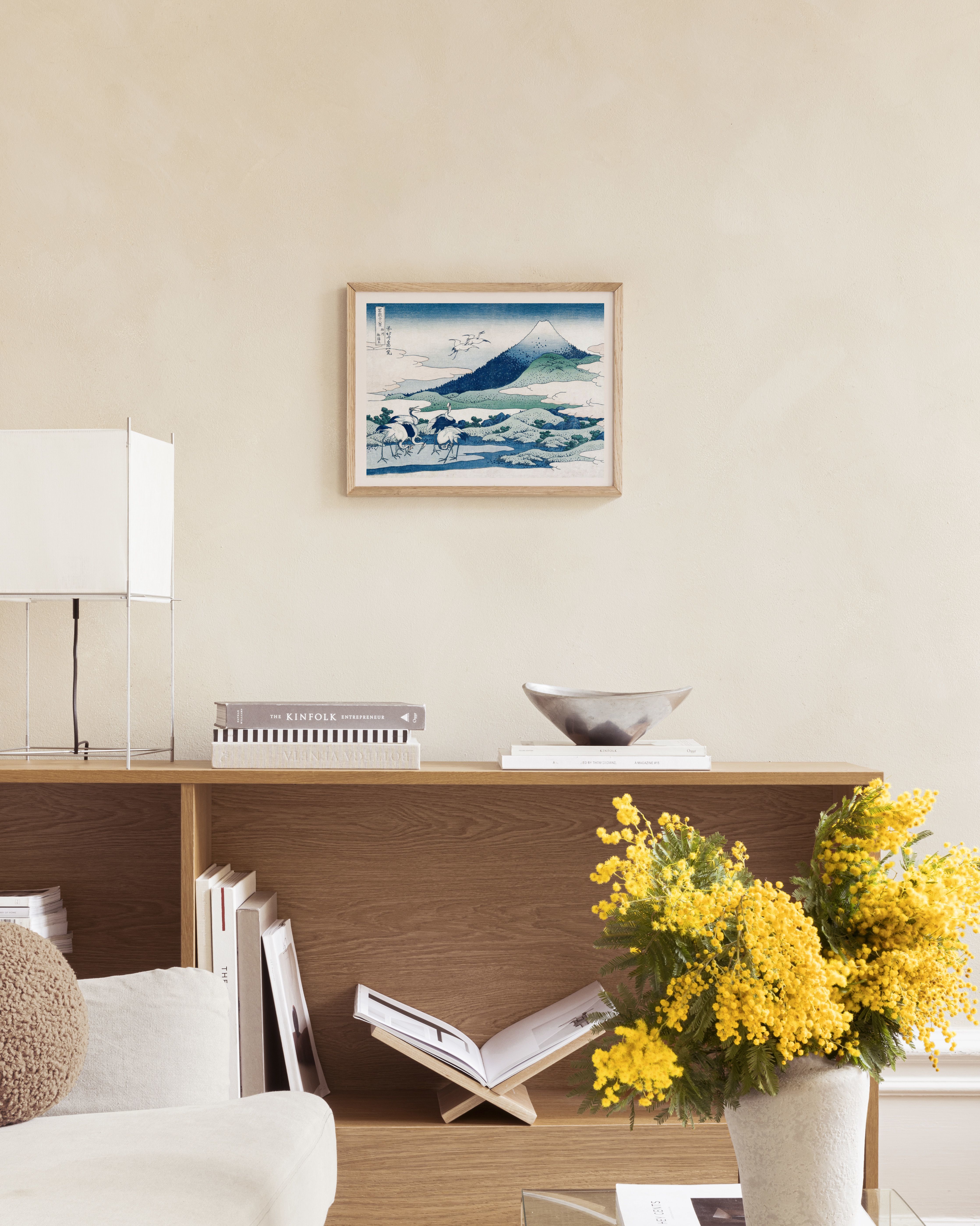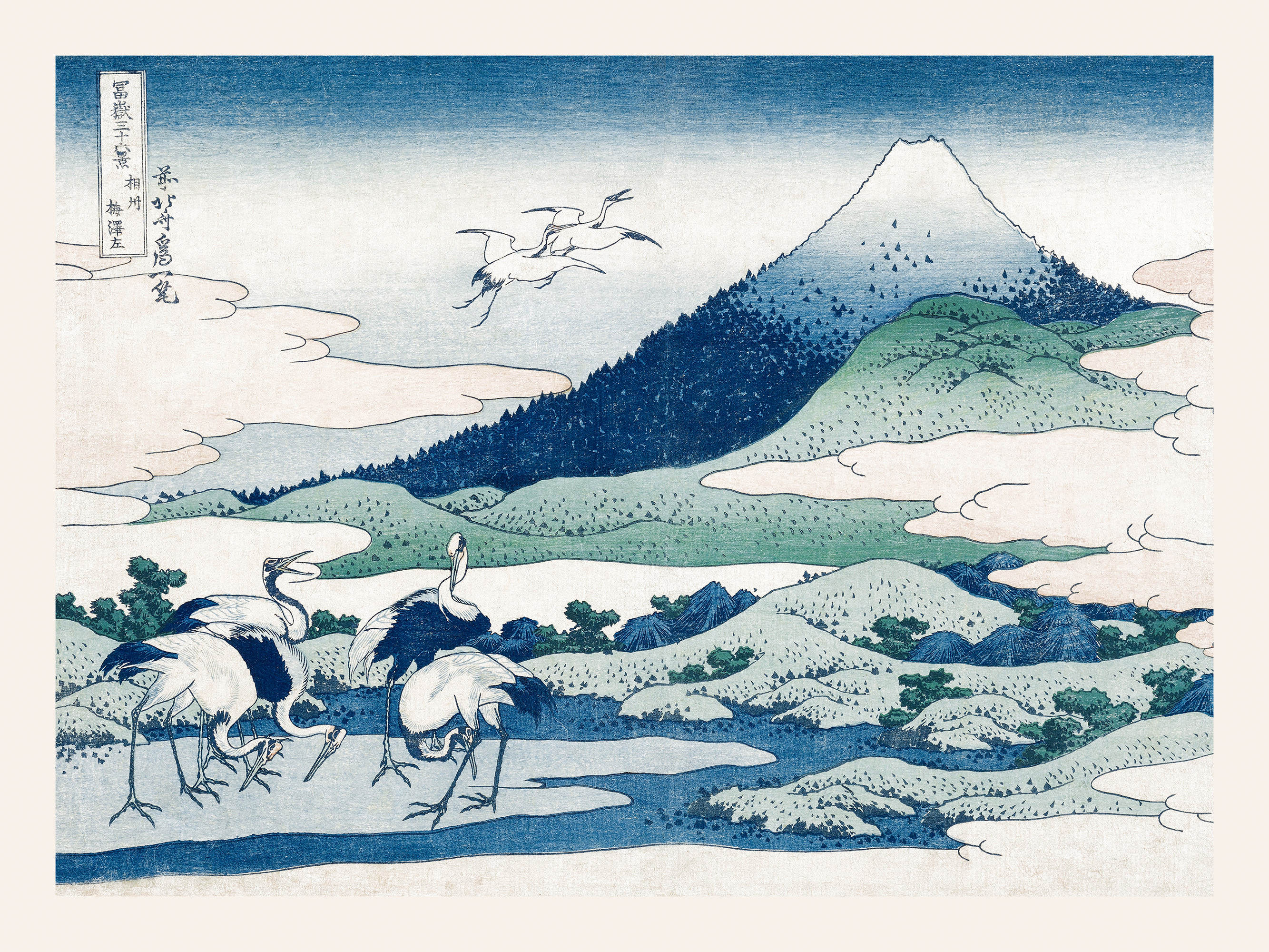 A beautiful poster featuring white cranes standing and flying over blue water. Green hills and a dark blue mountain create a peaceful landscape in the background.