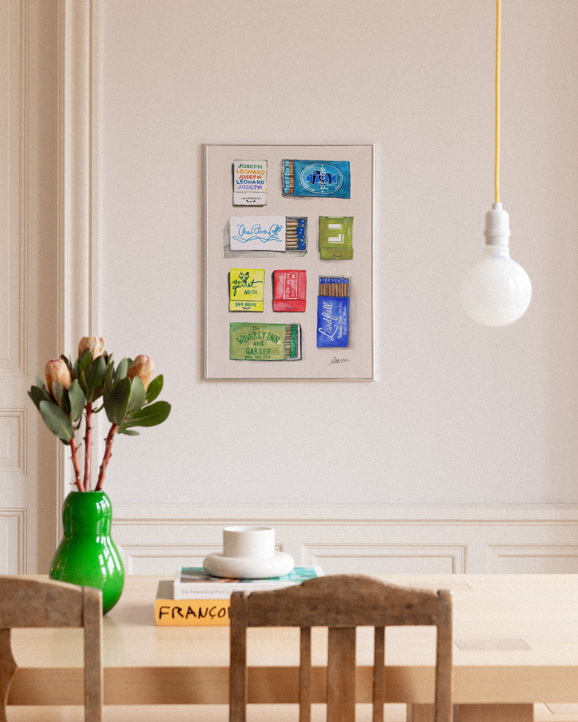 A colourful print featuring eight matchbooks with playful designs in blue, green, red, yellow, and white. Perfect wall art to add a fun touch to your home.