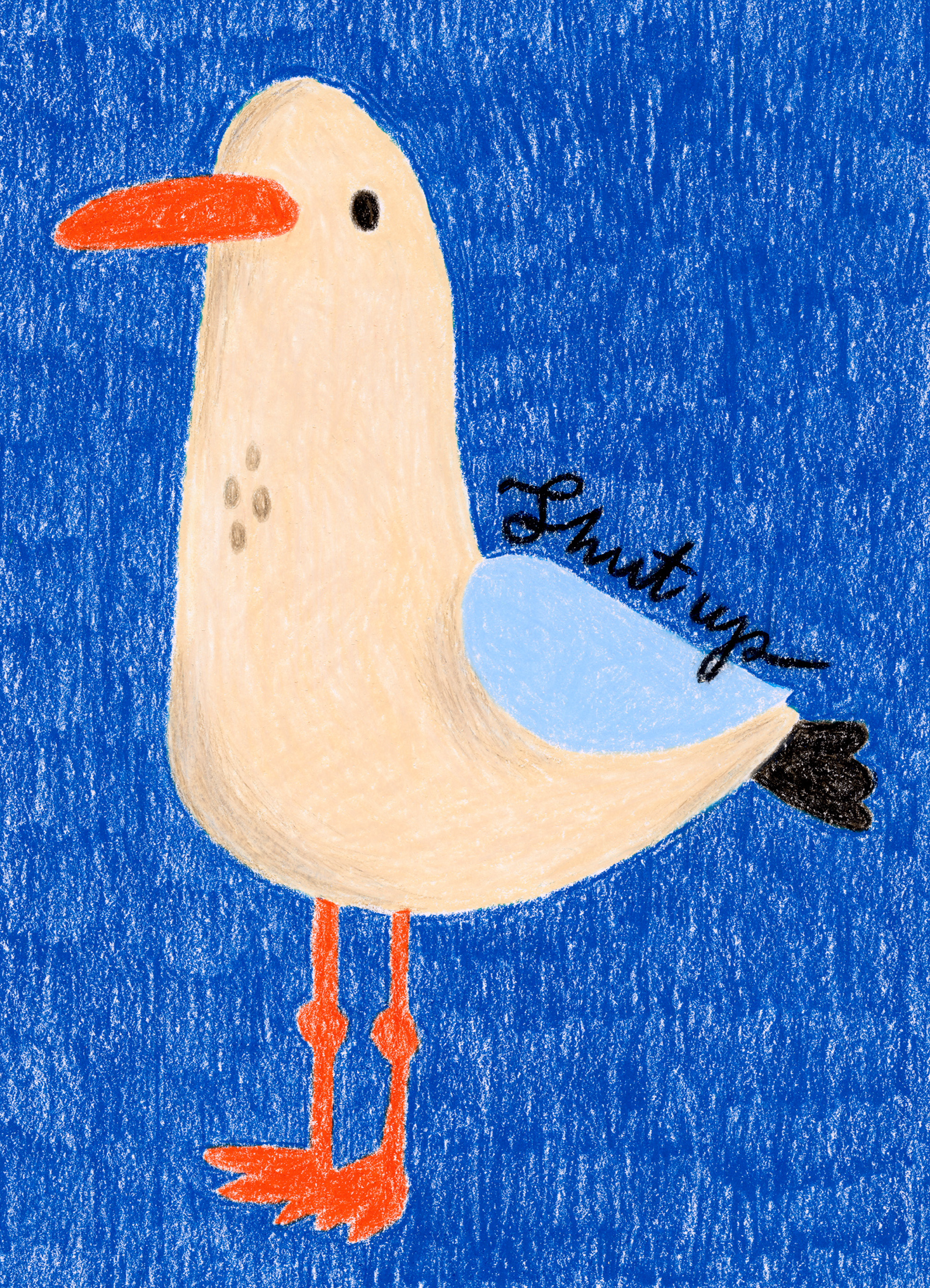 A fun print of a cartoon bird with a beige body, orange beak, and light blue wing on a blue background.
