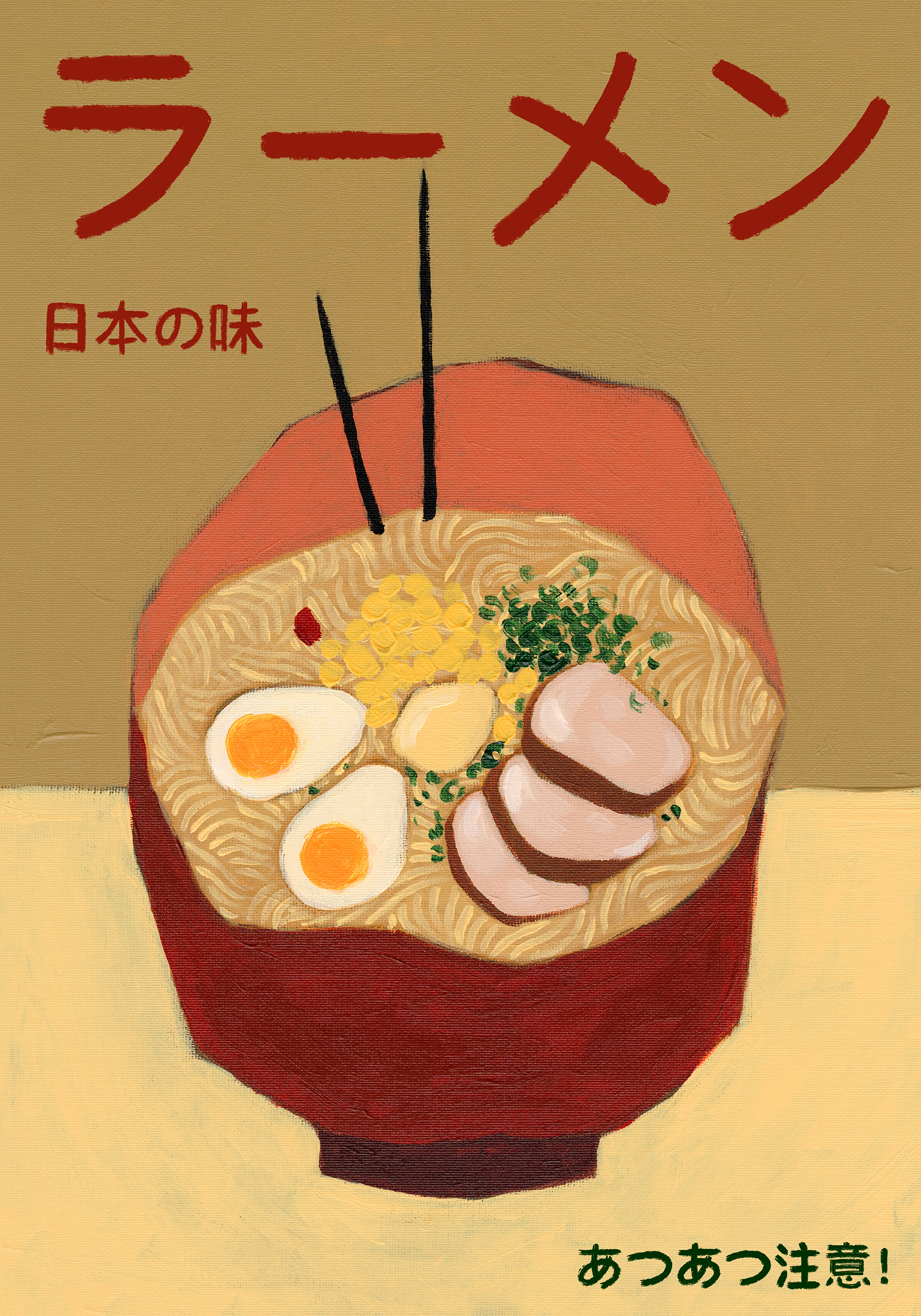From $26.22A simple illustration of a bowl of ramen with noodles, eggs, and meat. This colourful print features red and beige tones with Japanese characters.