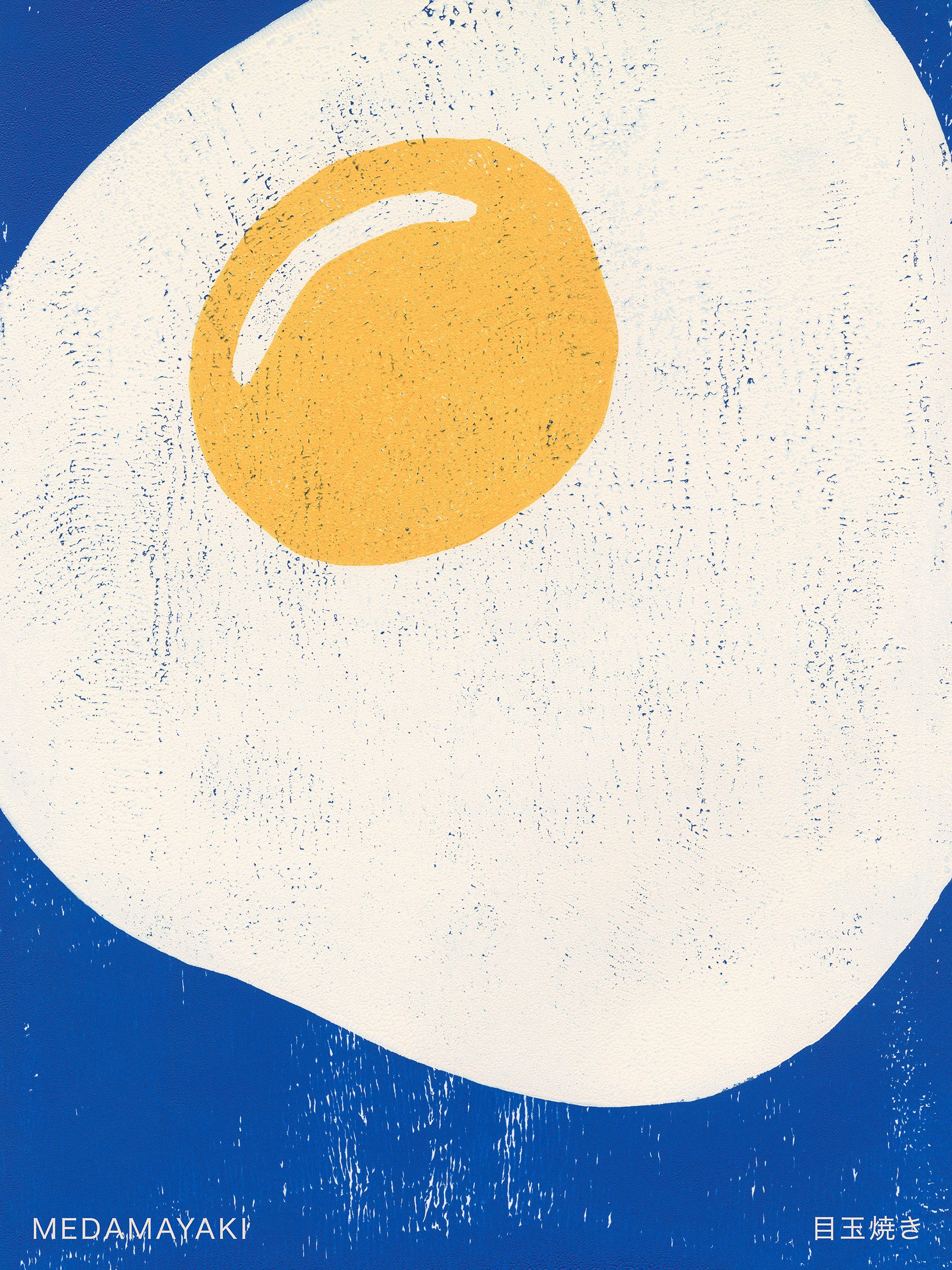 A simple illustration print of a fried egg with a bright yellow yolk on a blue background. Perfect wall art for your kitchen!