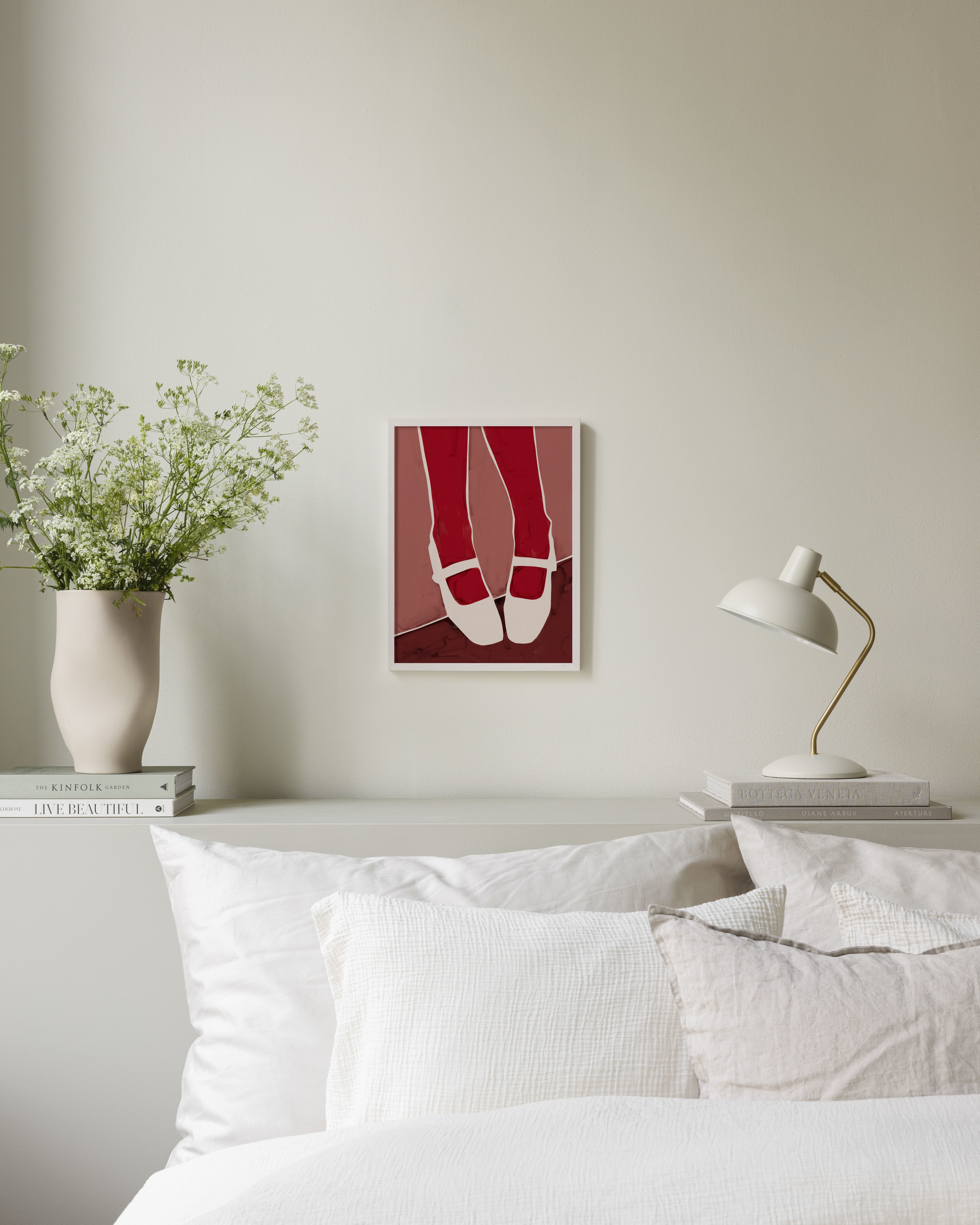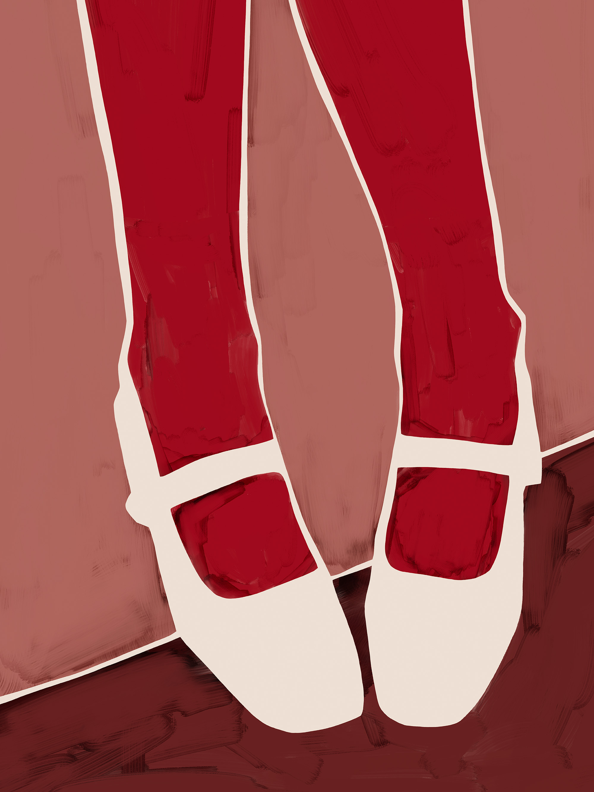 A poster illustrating two legs in red stockings and white shoes against a soft brown background. Bold colours and a smooth, abstract style.