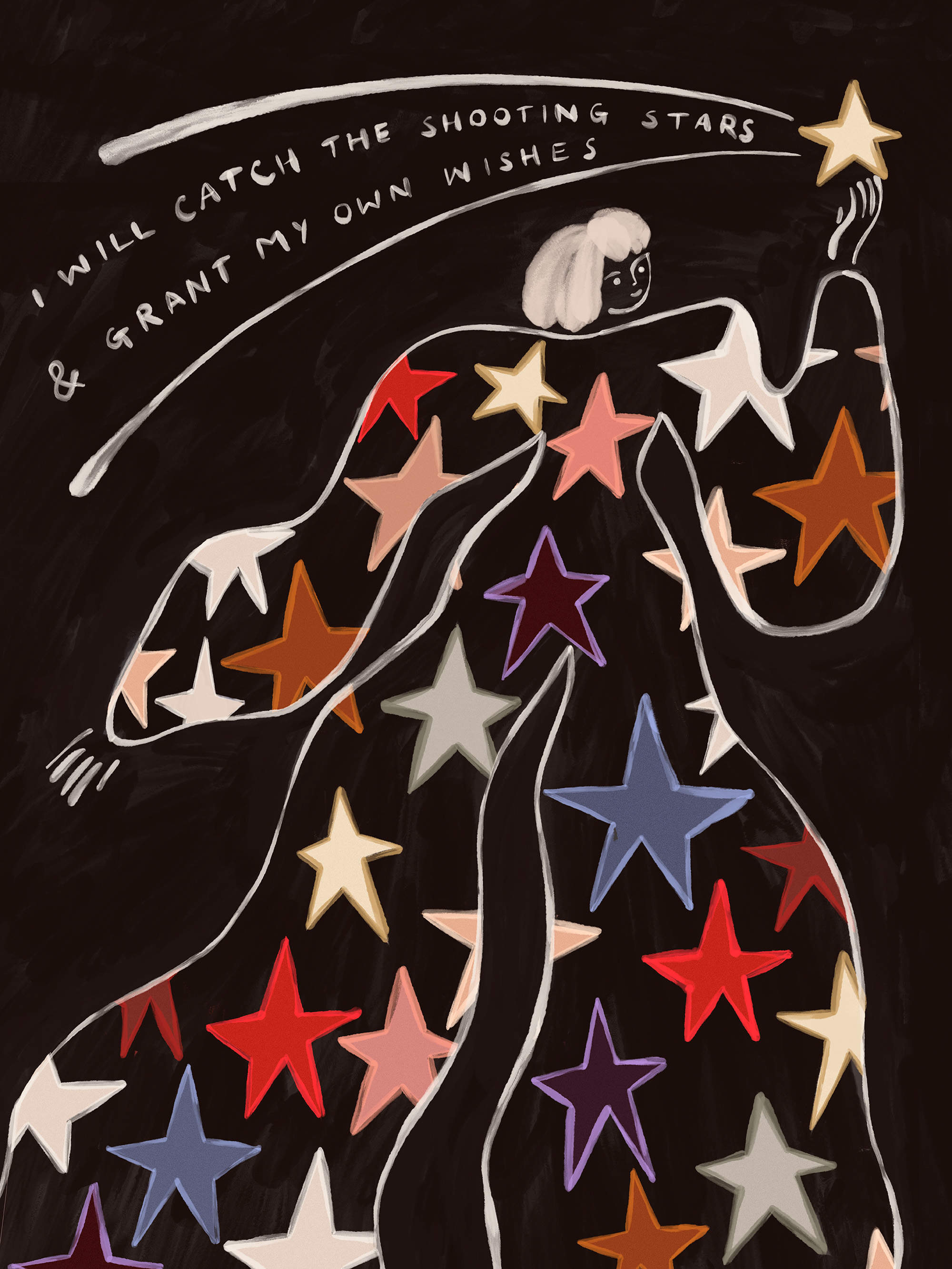 A poster of a person in a dark robe covered in colourful stars, reaching up to a yellow star. Perfect wall art for anyone who believes in making their own wishes come true.