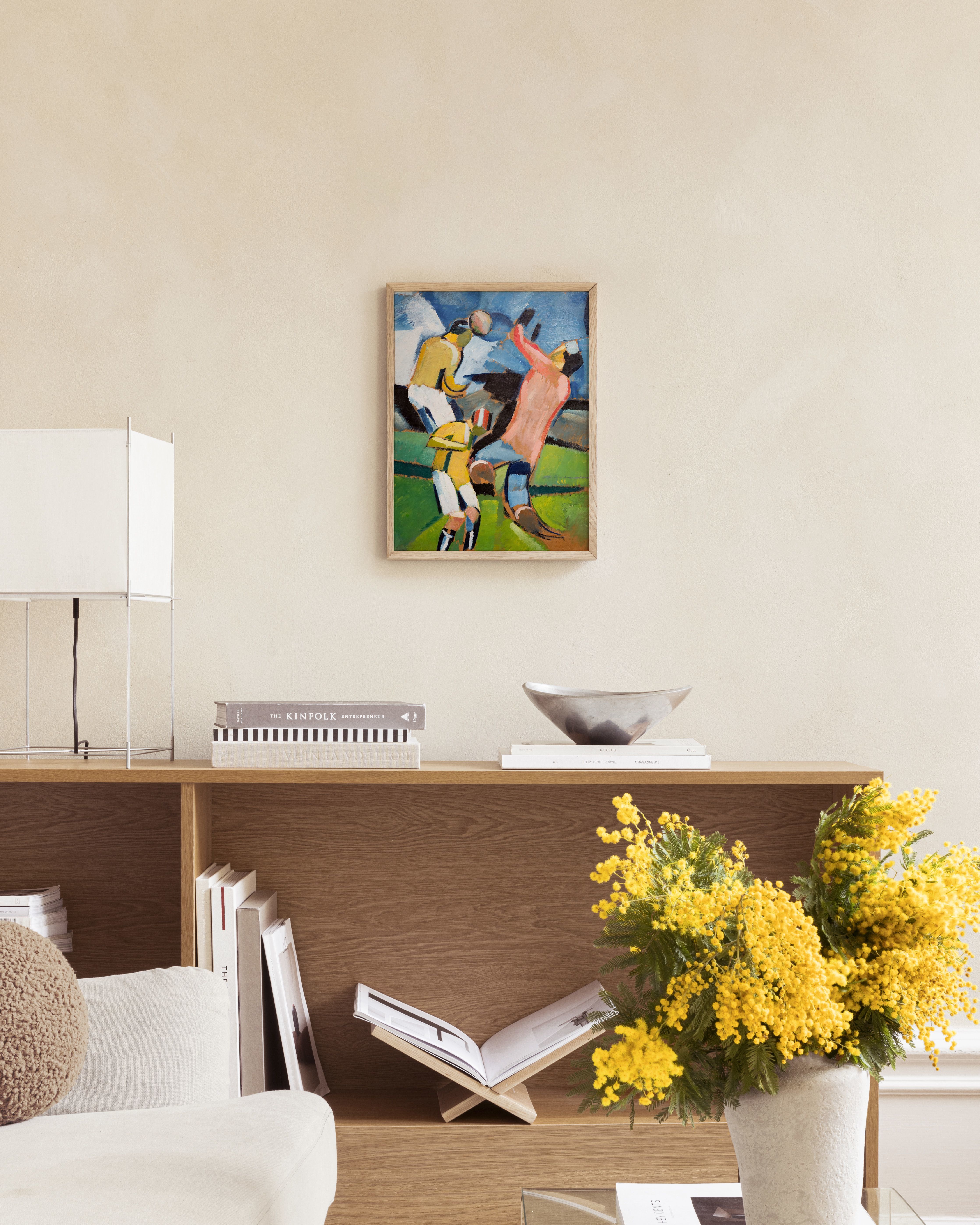 From $24.98A poster illustrating three abstract figures playing football in bold colours of yellow, pink, blue, and green. The angular and geometric style creates an energetic look, perfect for adding a playful touch to your wall art.