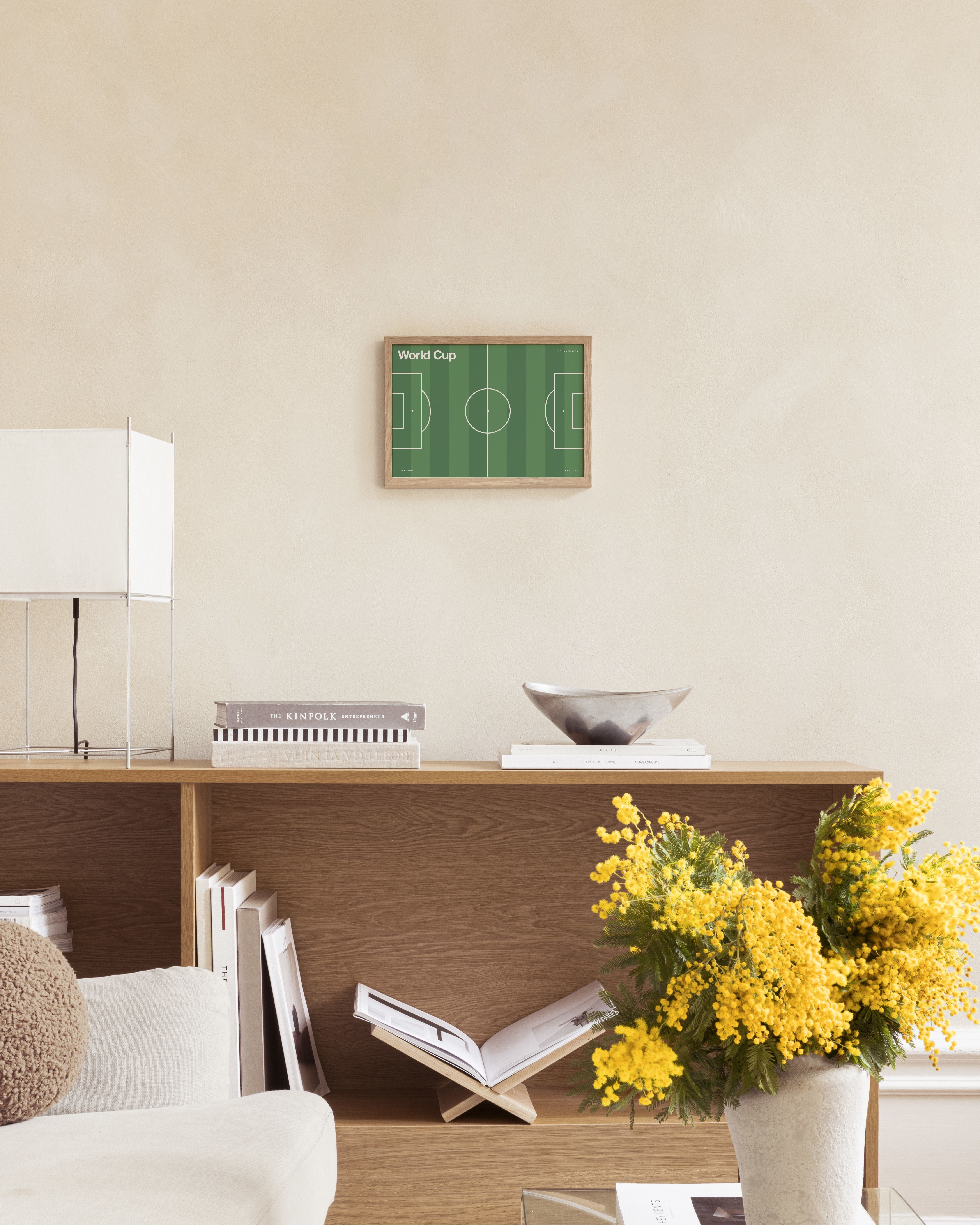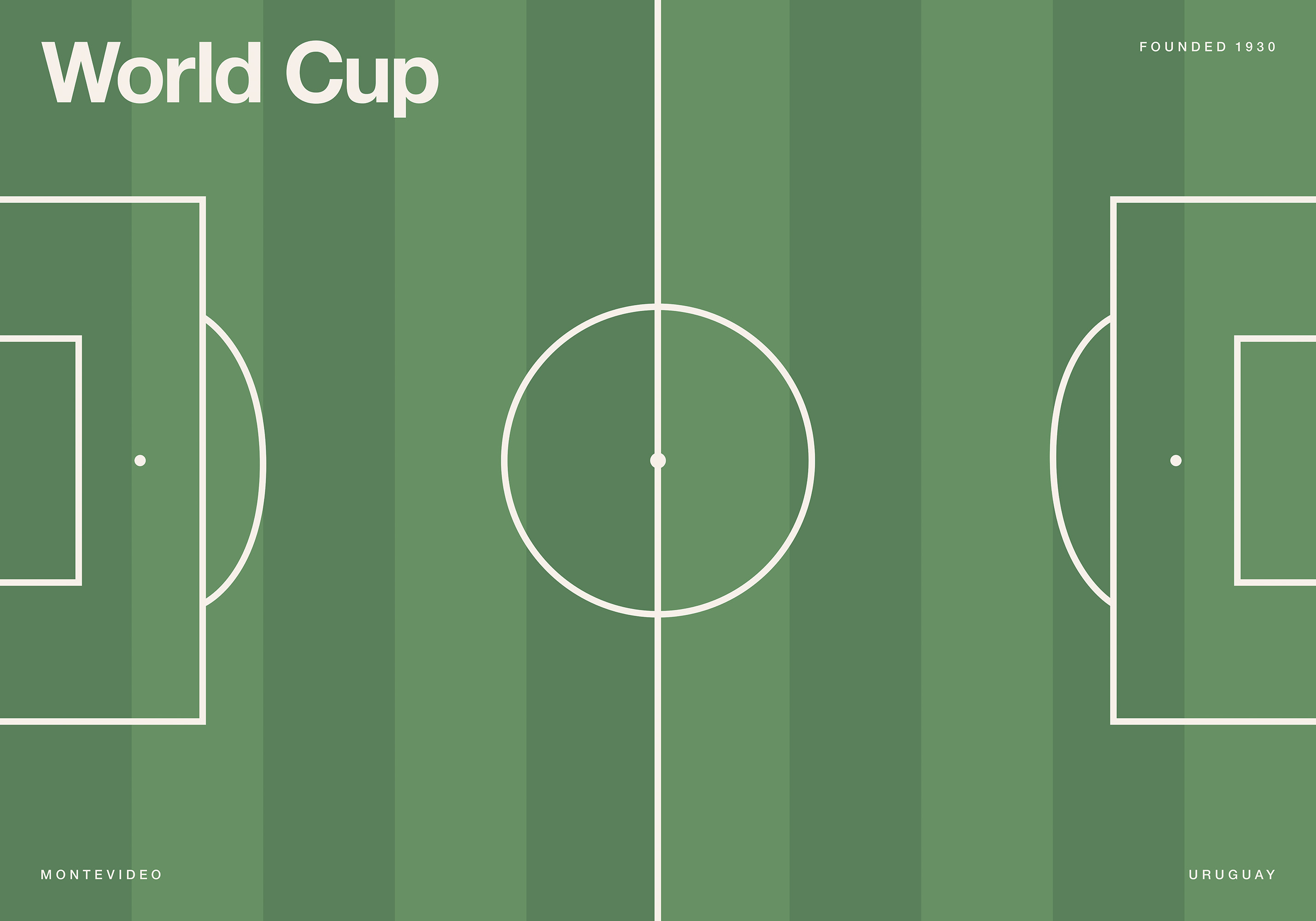 From $24.98A poster of a green football pitch with white lines and goals. Features "World Cup" text and references to the 1930 tournament in Uruguay.