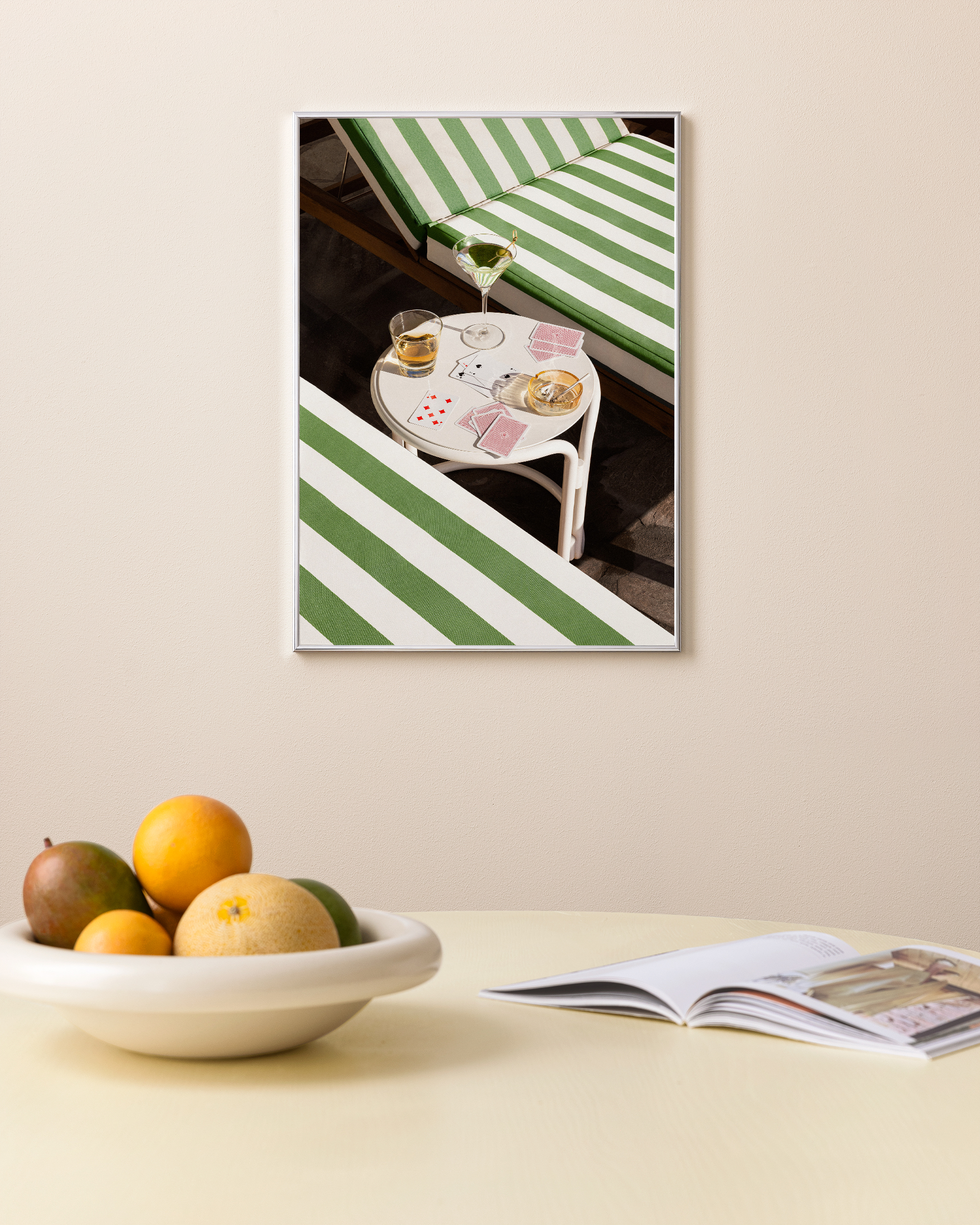 A print of green and white striped lounge chairs around a small table with drinks and playing cards. Perfect wall art for a relaxed and summery vibe.