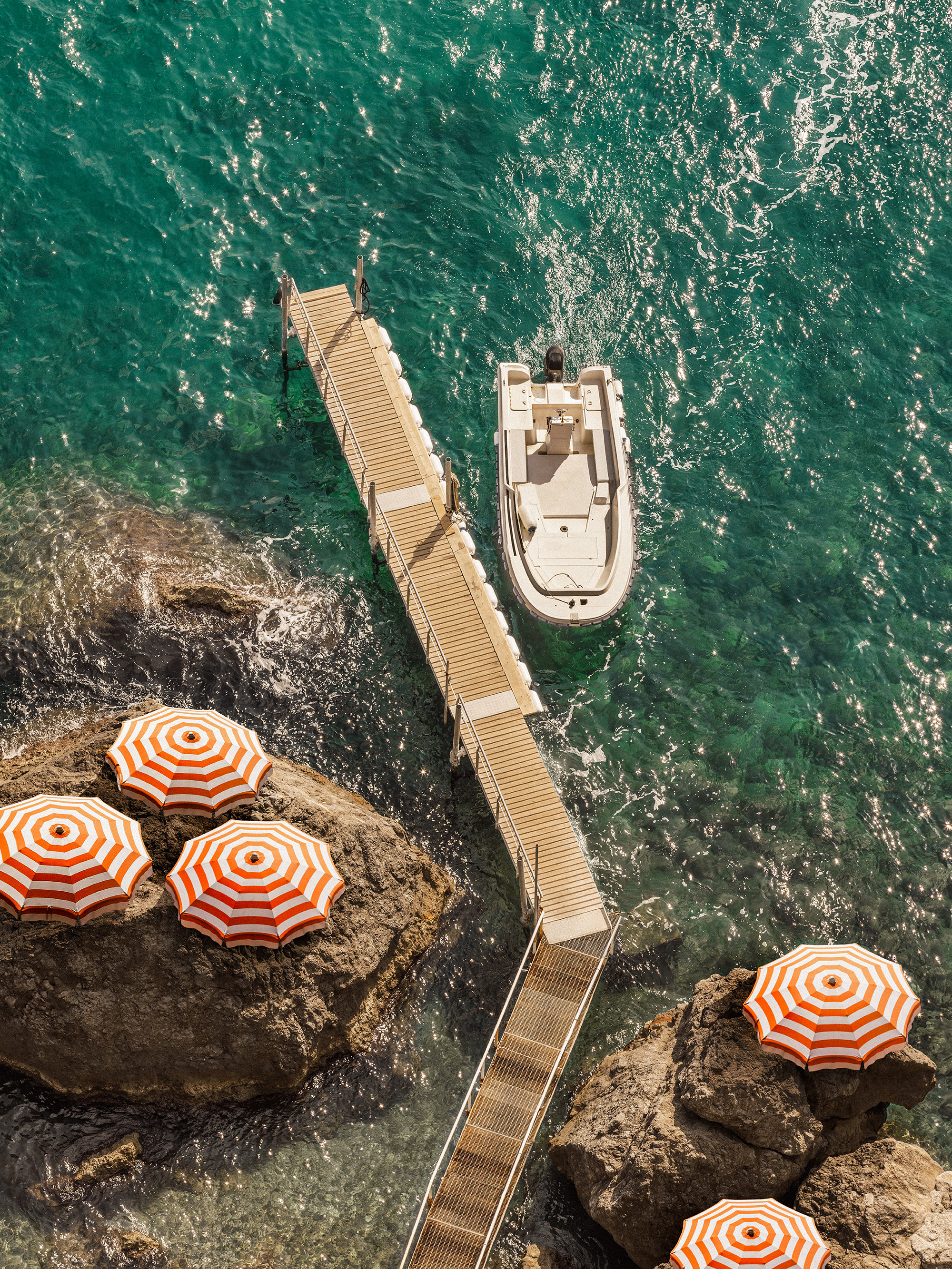 A photo print of a wooden dock extending into sparkling turquoise water with a white boat and striped umbrellas on the rocks.