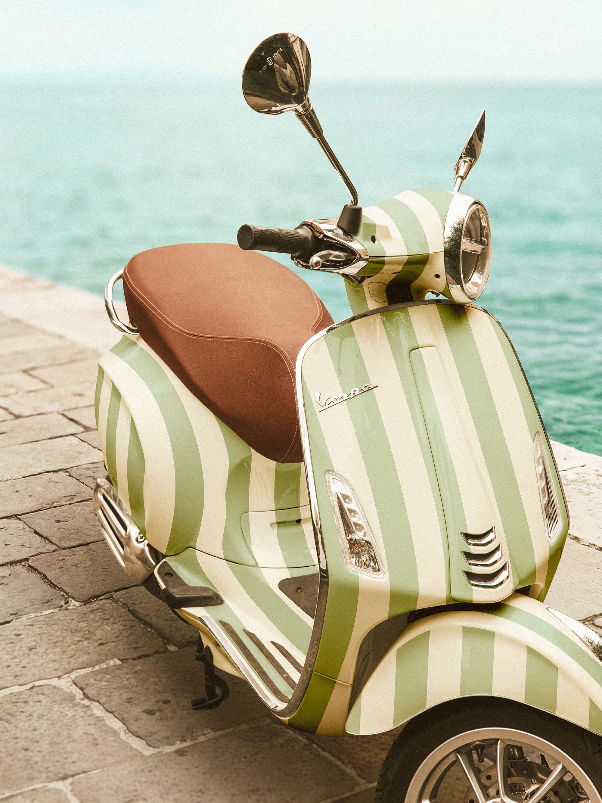 A print of a green and white striped scooter parked by turquoise water. Perfect wall art to add a retro touch to your home.