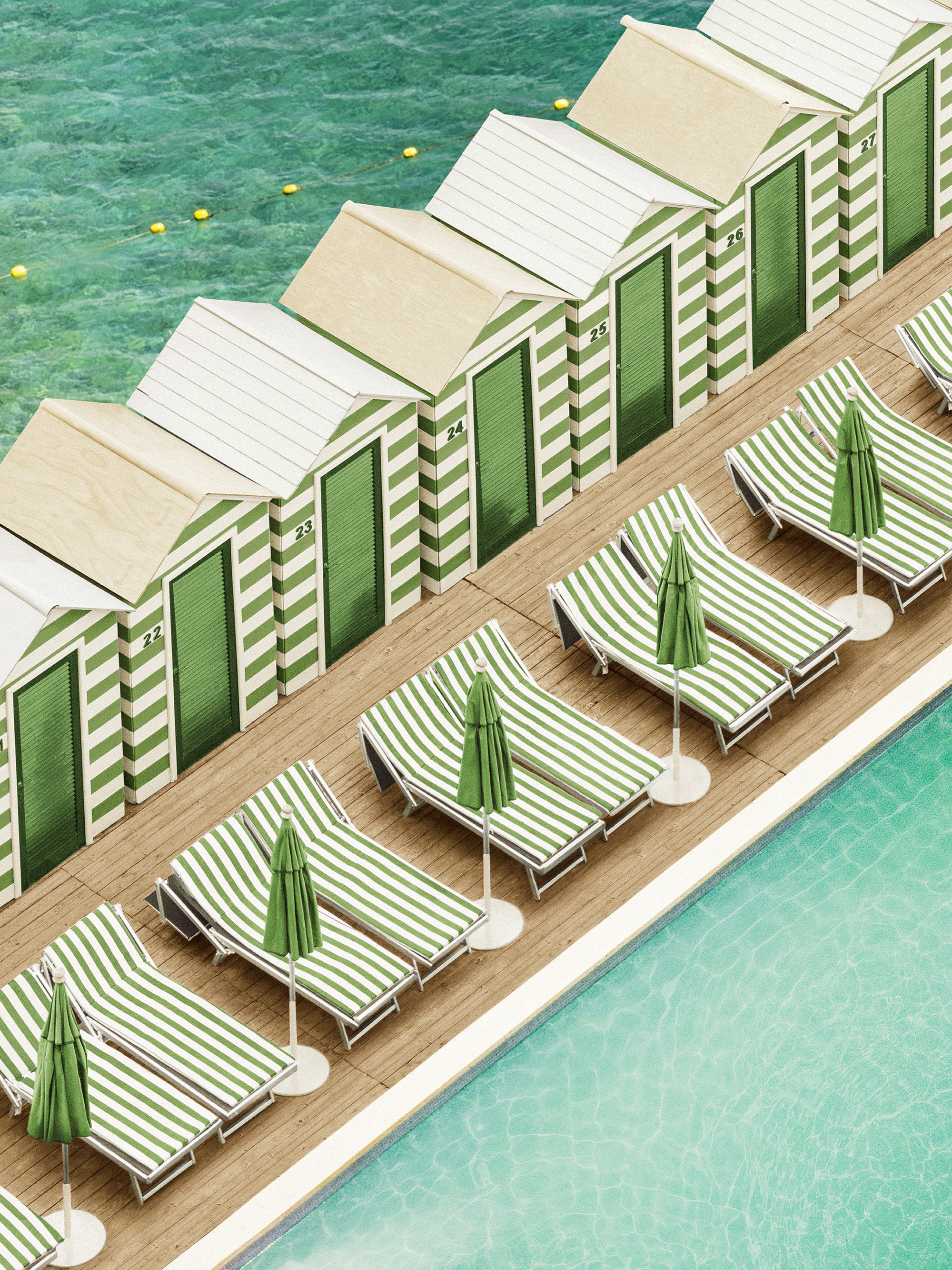 A print illustrating a wooden deck with green and white striped lounge chairs, each with a green umbrella. Perfect wall art for your home.