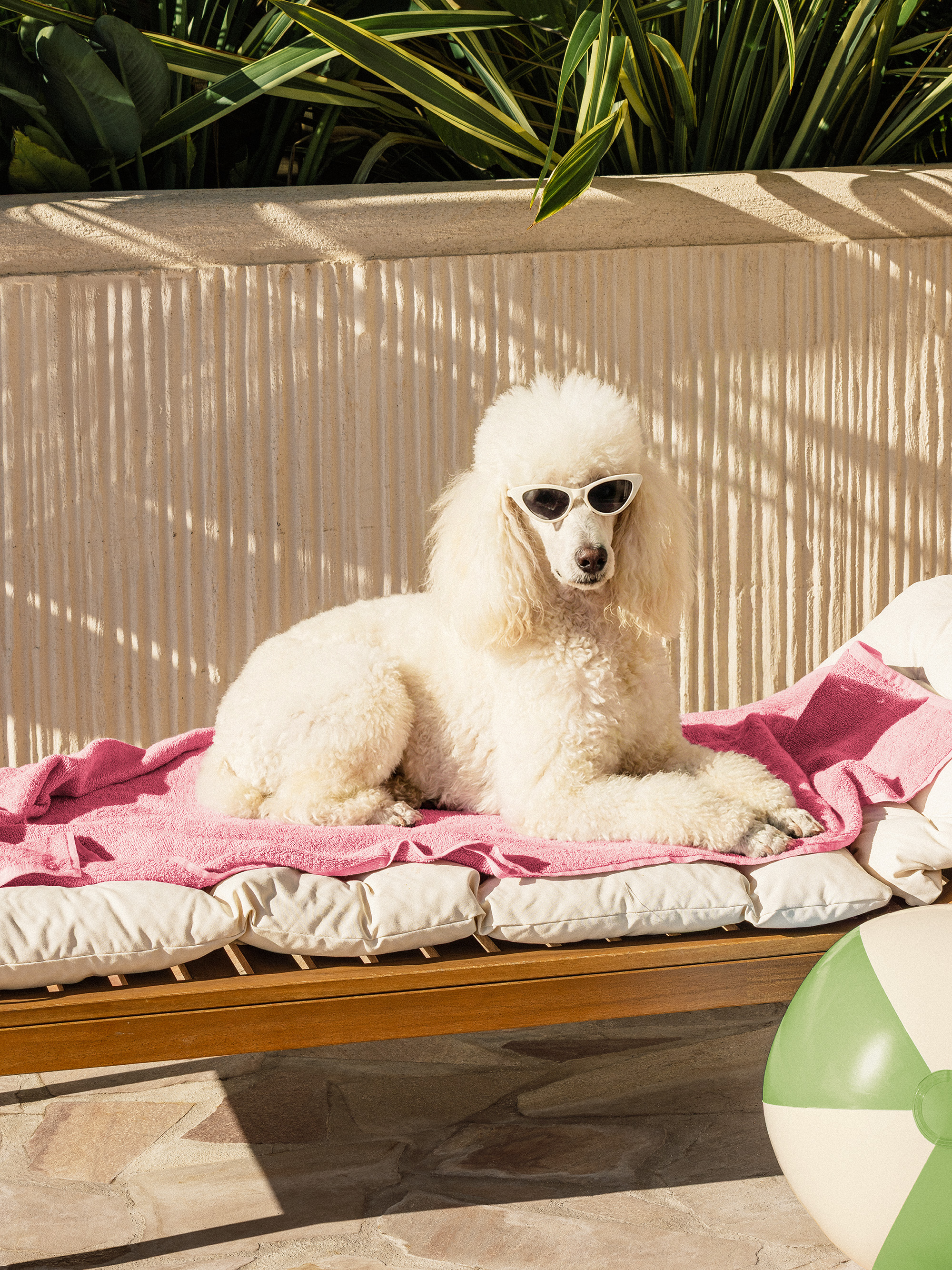 A fun print of a fluffy white poodle wearing sunglasses, relaxing on a pink towel with a beach ball nearby. Perfect wall art to brighten up your home!