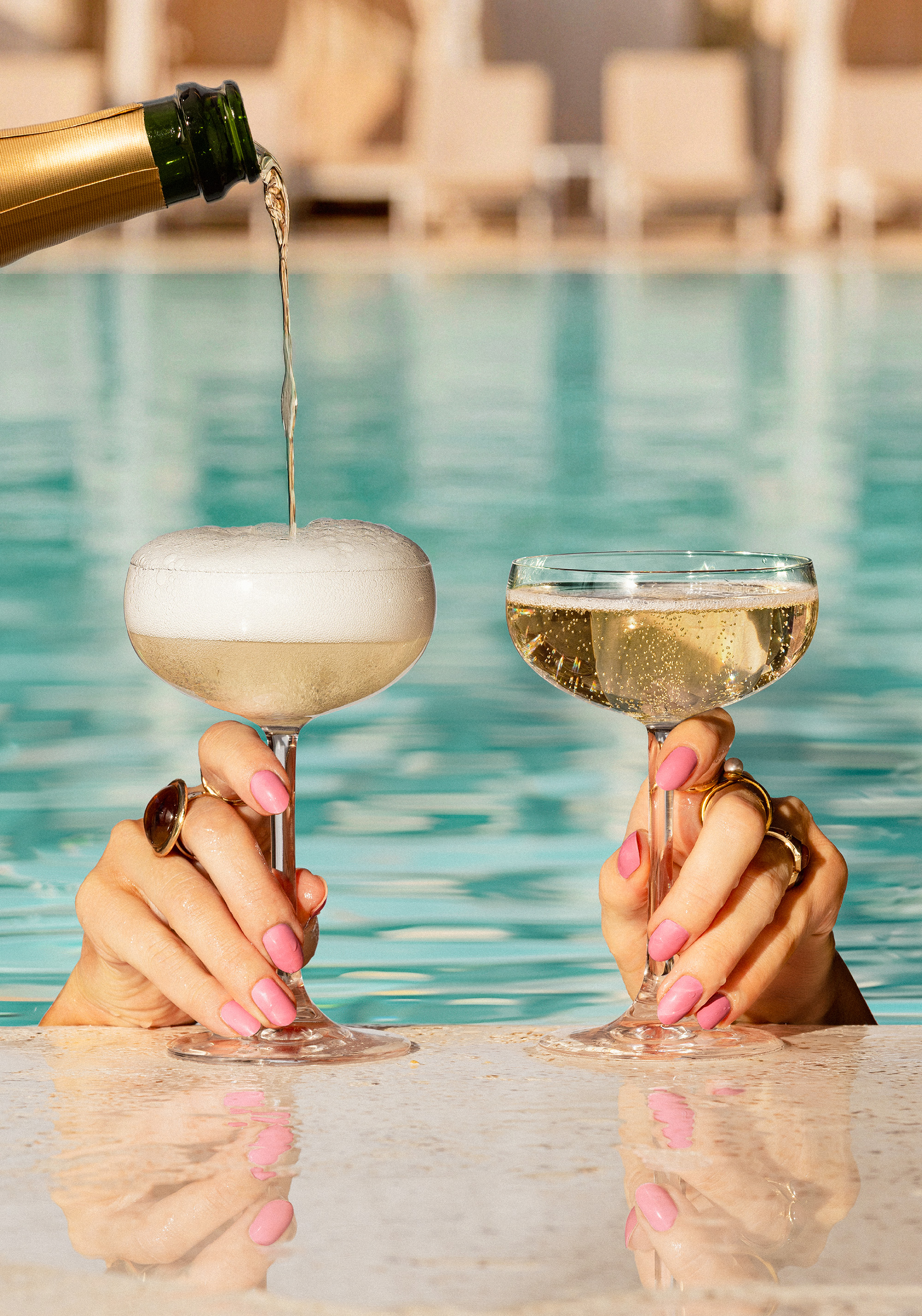 A print of two hands holding champagne glasses by a turquoise pool. Perfect wall art to bring summer vibes to your home.